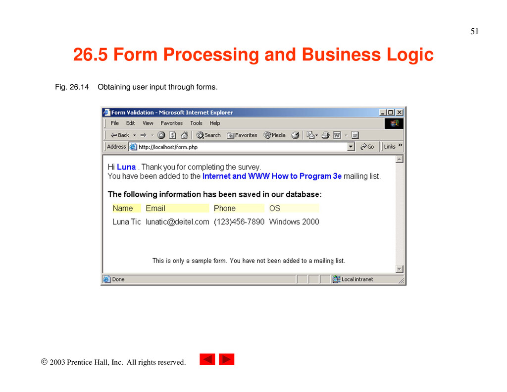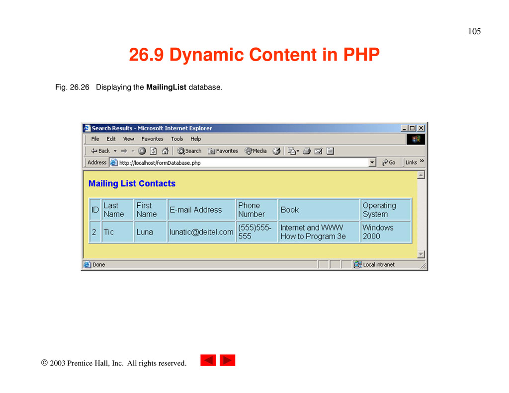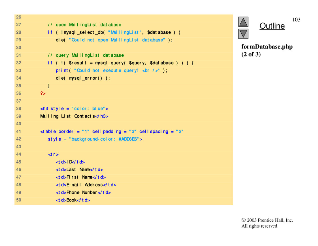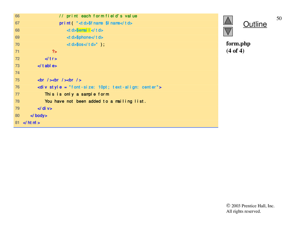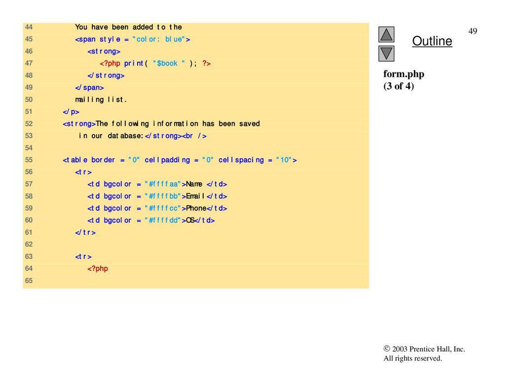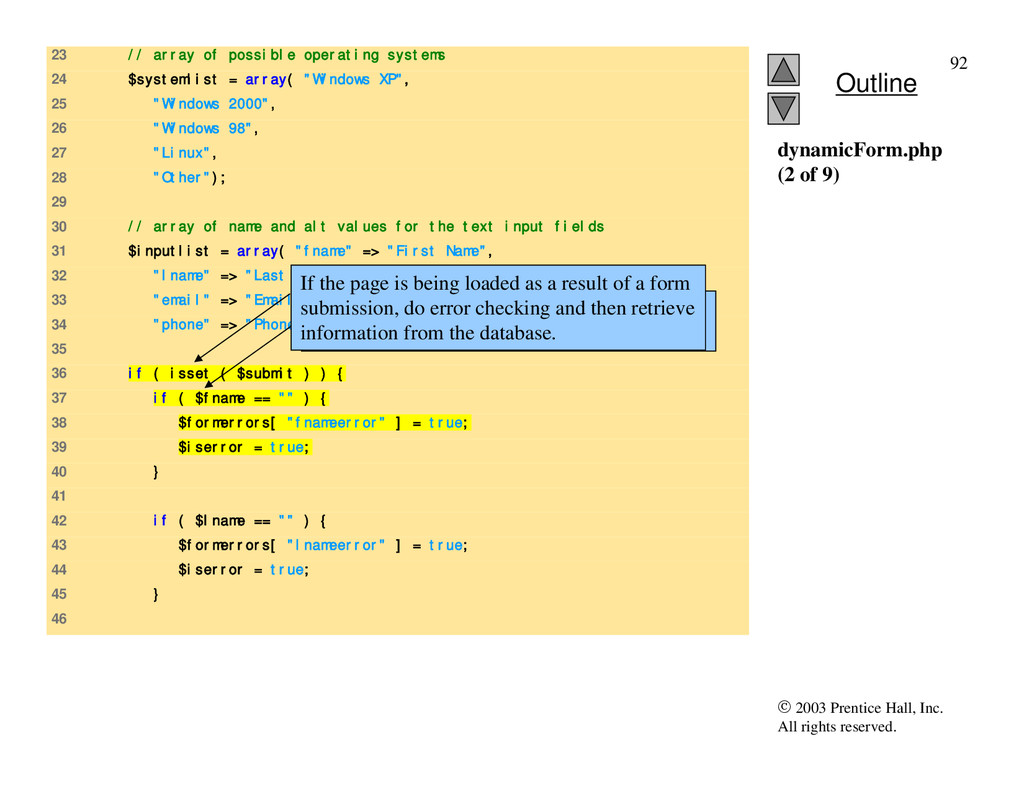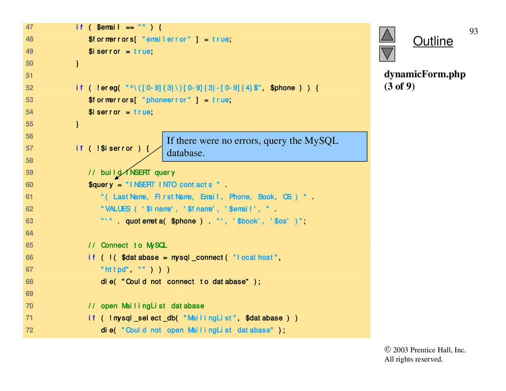 47 if ( $email == "" ) { 48 $formerrors[ "emailerror" ] = true; 49 $iserror = true; 50 } 51 52 if ( !ereg( "^\([0-9]{3}\)[0-9]{3}-[0-9]{4}$", $phone ) ) { 53 $formerrors[ "phoneerror" ] = true; 54 $iserror = true; 55 } 56 57 if ( !$iserror ) { 58 59 // build INSERT query 60 $query = "INSERT INTO contacts " . 61 "( LastName, FirstName, Email, Phone, Book, OS ) " . 62 "VALUES ( '$lname', '$fname', '$email', " . 63 "'" . quotemeta( $phone ) . "', '$book', '$os' )"; 64 65 // Connect to MySQL 66 if ( !( $database = mysql_connect( "localhost", 67 "httpd", "" ) ) ) 68 die( "Could not connect to database" ); 69 70 // open MailingList database 71 if ( !mysql_select_db( "MailingList", $database ) ) 72 die( "Could not open MailingList database" ); dynamicForm.php (3 of 9) If there were no errors, query the MySQL database.