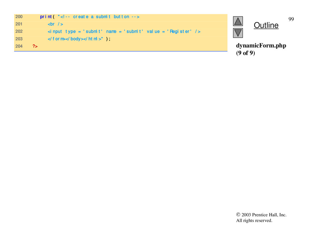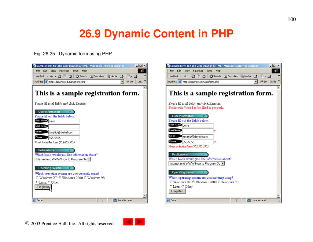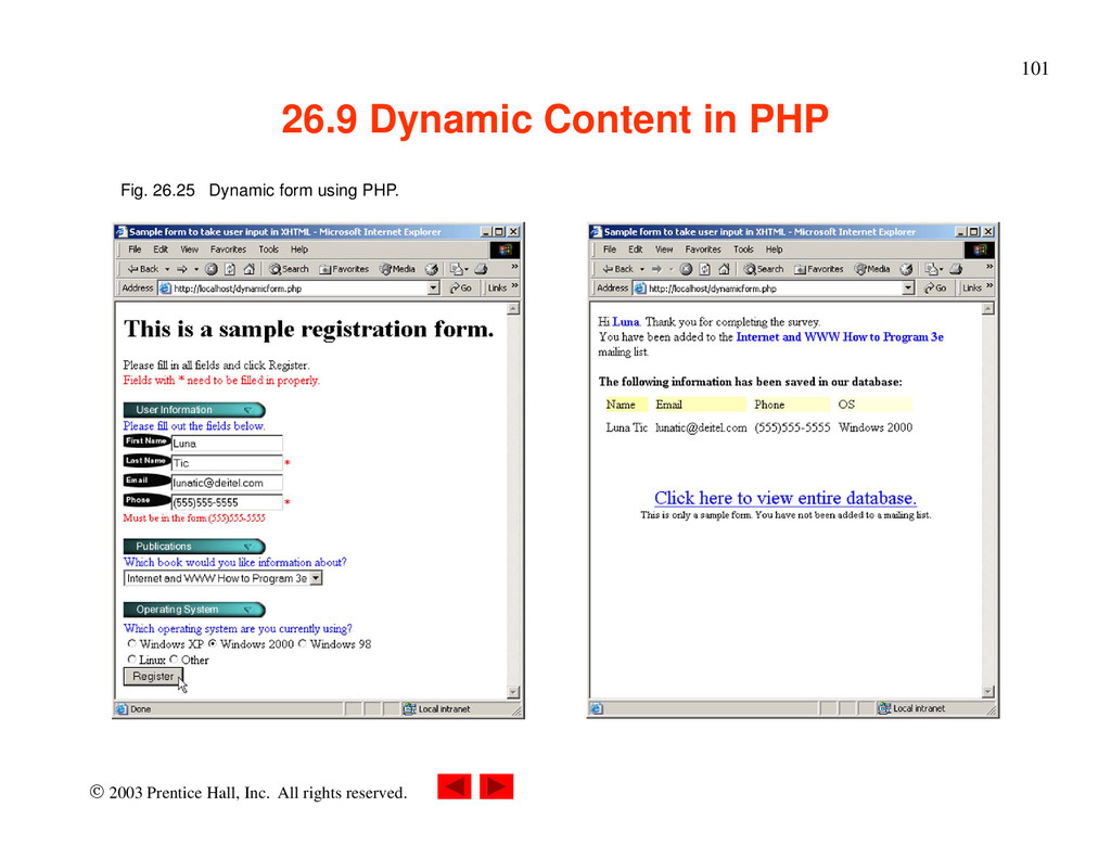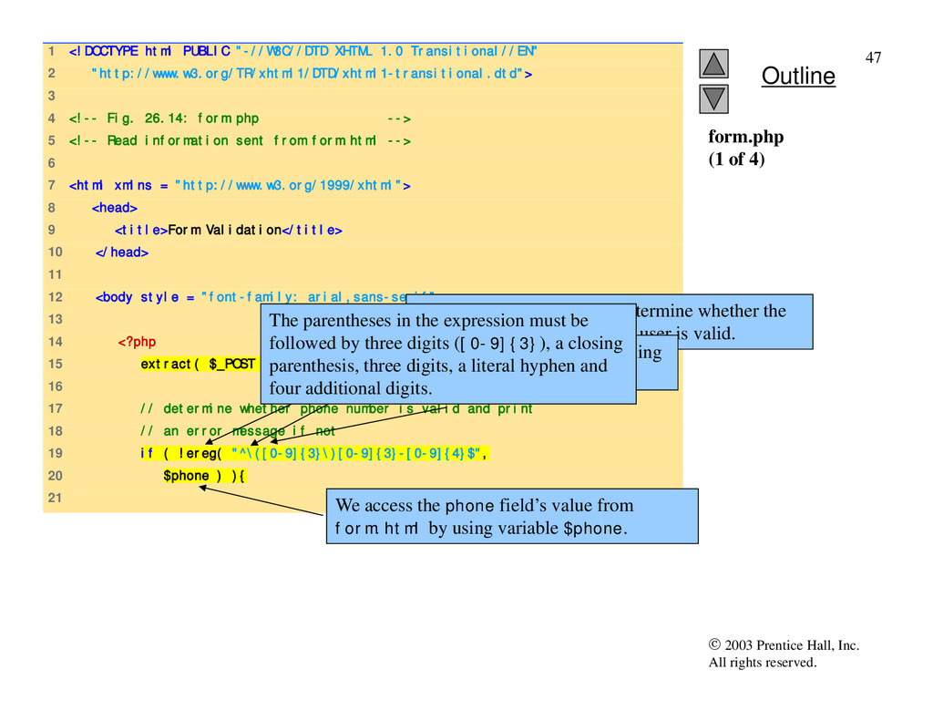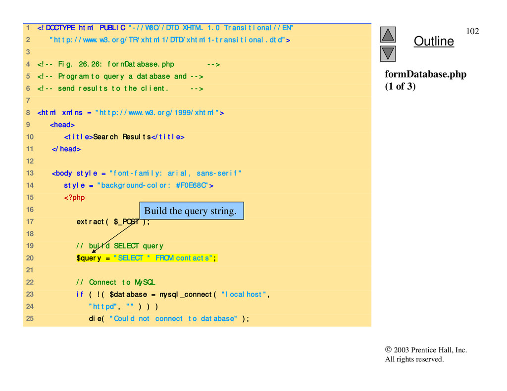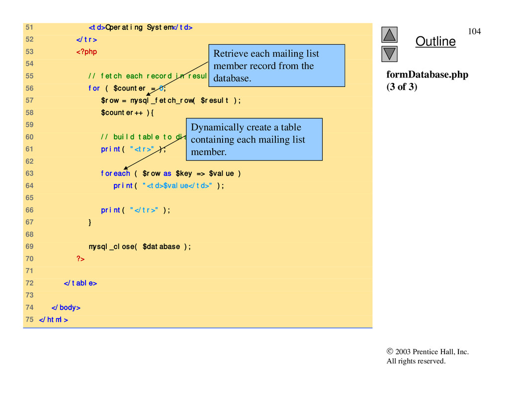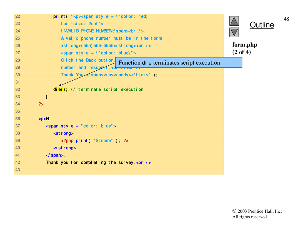 47 if ( $email == "" ) { 48 $formerrors[ "emailerror" ] = true; 49 $iserror = true; 50 } 51 52 if ( !ereg( "^\([0-9]{3}\)[0-9]{3}-[0-9]{4}$", $phone ) ) { 53 $formerrors[ "phoneerror" ] = true; 54 $iserror = true; 55 } 56 57 if ( !$iserror ) { 58 59 // build INSERT query 60 $query = "INSERT INTO contacts " . 61 "( LastName, FirstName, Email, Phone, Book, OS ) " . 62 "VALUES ( '$lname', '$fname', '$email', " . 63 "'" . quotemeta( $phone ) . "', '$book', '$os' )"; 64 65 // Connect to MySQL 66 if ( !( $database = mysql_connect( "localhost", 67 "httpd", "" ) ) ) 68 die( "Could not connect to database" ); 69 70 // open MailingList database 71 if ( !mysql_select_db( "MailingList", $database ) ) 72 die( "Could not open MailingList database" ); dynamicForm.php (3 of 9) If there were no errors, query the MySQL database.