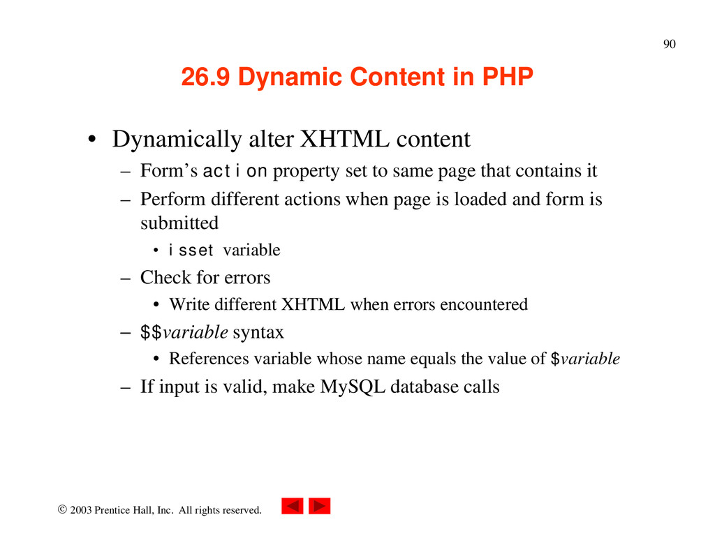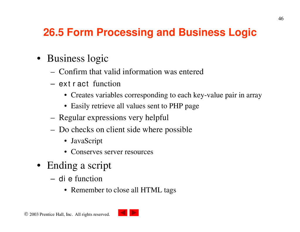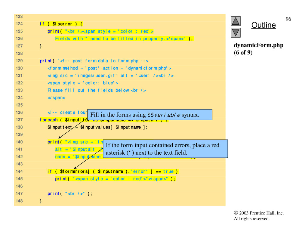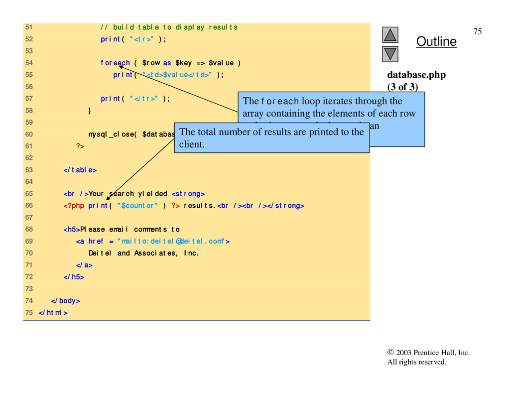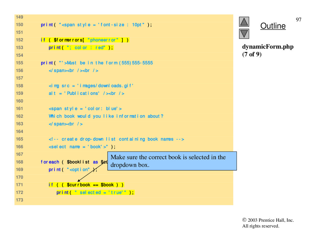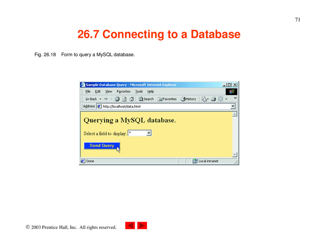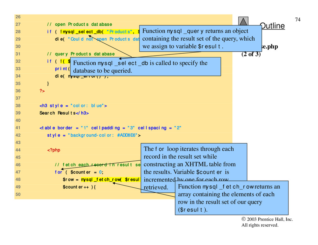 47 if ( $email == "" ) { 48 $formerrors[ "emailerror" ] = true; 49 $iserror = true; 50 } 51 52 if ( !ereg( "^\([0-9]{3}\)[0-9]{3}-[0-9]{4}$", $phone ) ) { 53 $formerrors[ "phoneerror" ] = true; 54 $iserror = true; 55 } 56 57 if ( !$iserror ) { 58 59 // build INSERT query 60 $query = "INSERT INTO contacts " . 61 "( LastName, FirstName, Email, Phone, Book, OS ) " . 62 "VALUES ( '$lname', '$fname', '$email', " . 63 "'" . quotemeta( $phone ) . "', '$book', '$os' )"; 64 65 // Connect to MySQL 66 if ( !( $database = mysql_connect( "localhost", 67 "httpd", "" ) ) ) 68 die( "Could not connect to database" ); 69 70 // open MailingList database 71 if ( !mysql_select_db( "MailingList", $database ) ) 72 die( "Could not open MailingList database" ); dynamicForm.php (3 of 9) If there were no errors, query the MySQL database.