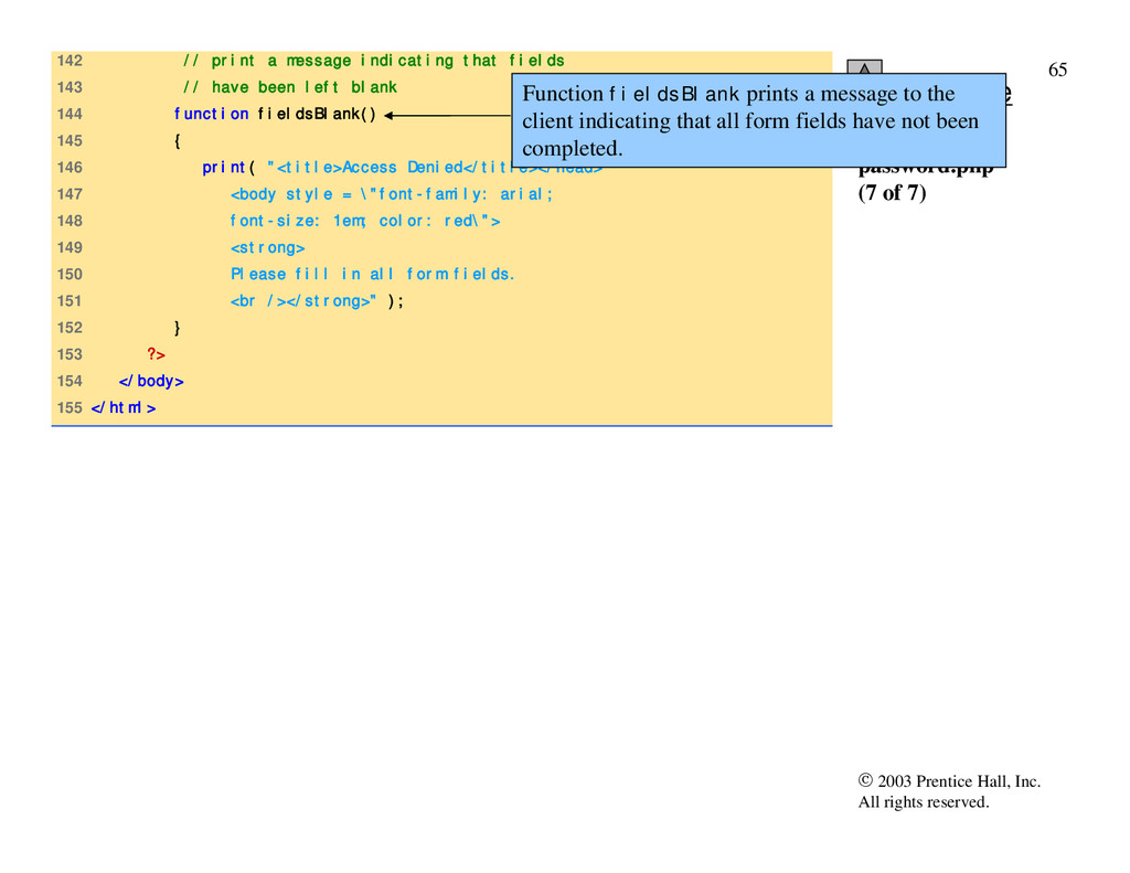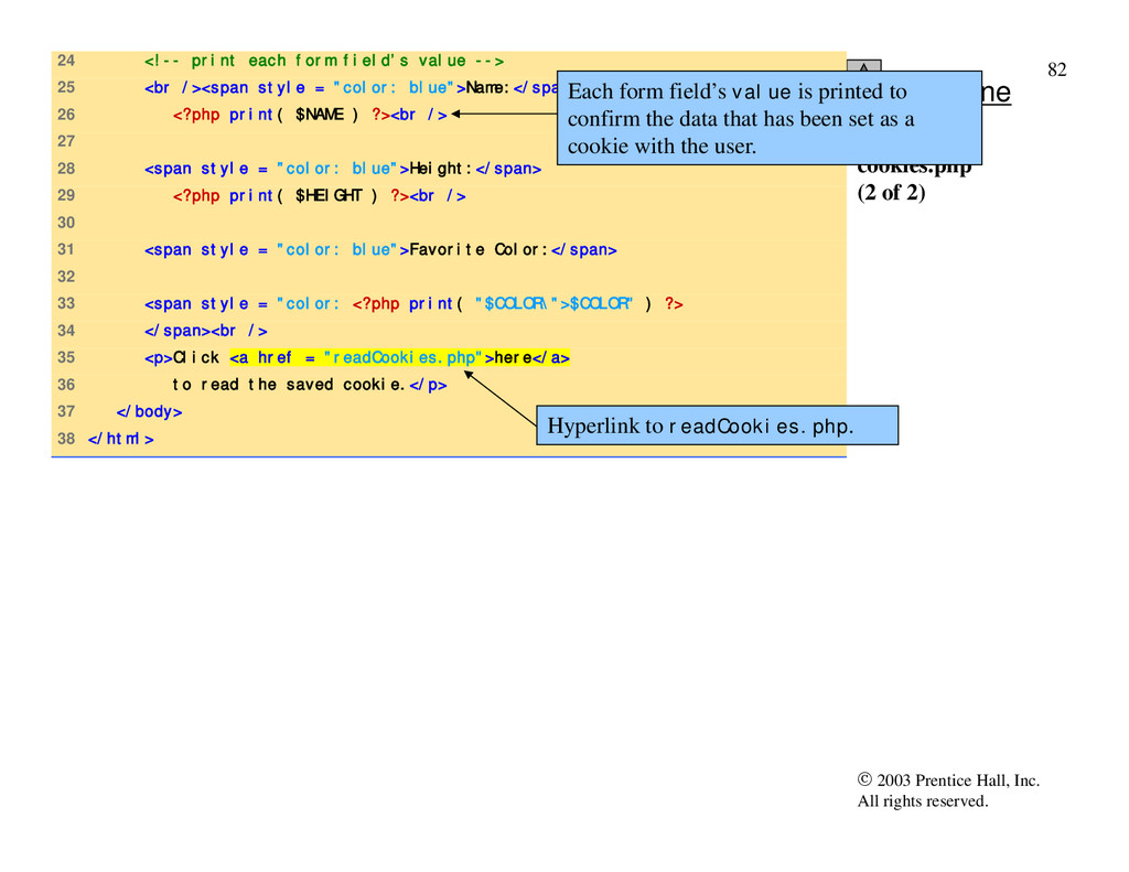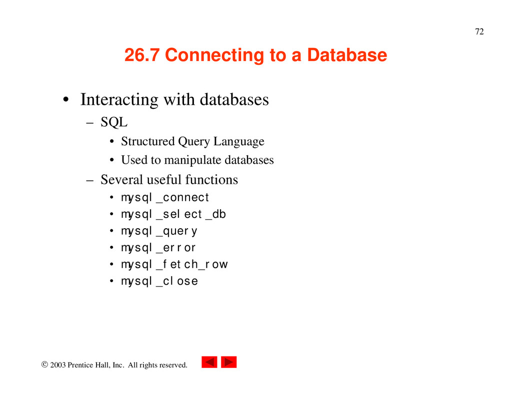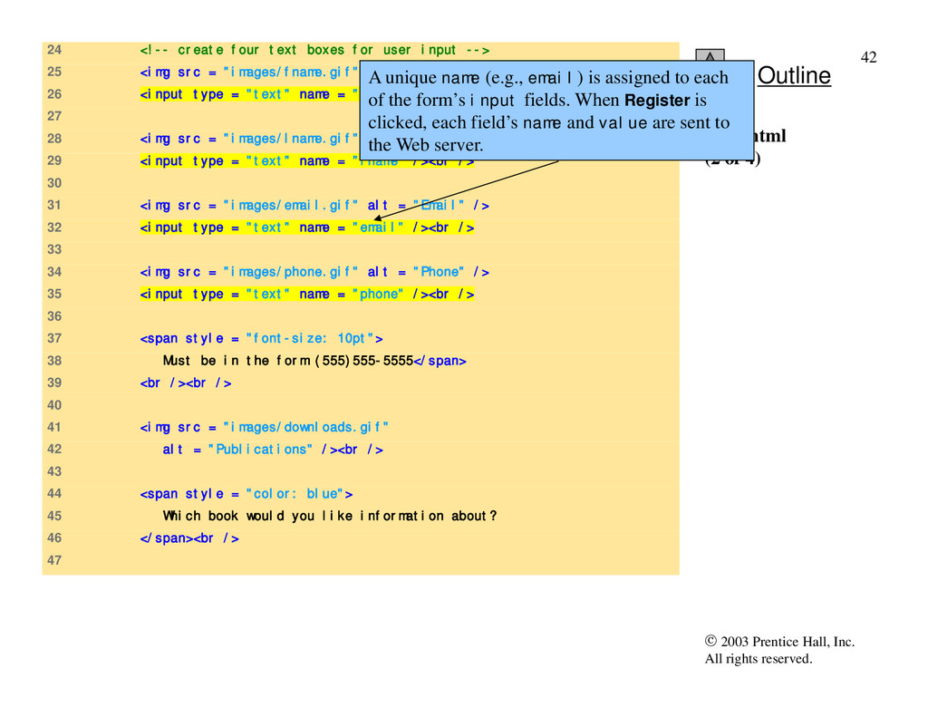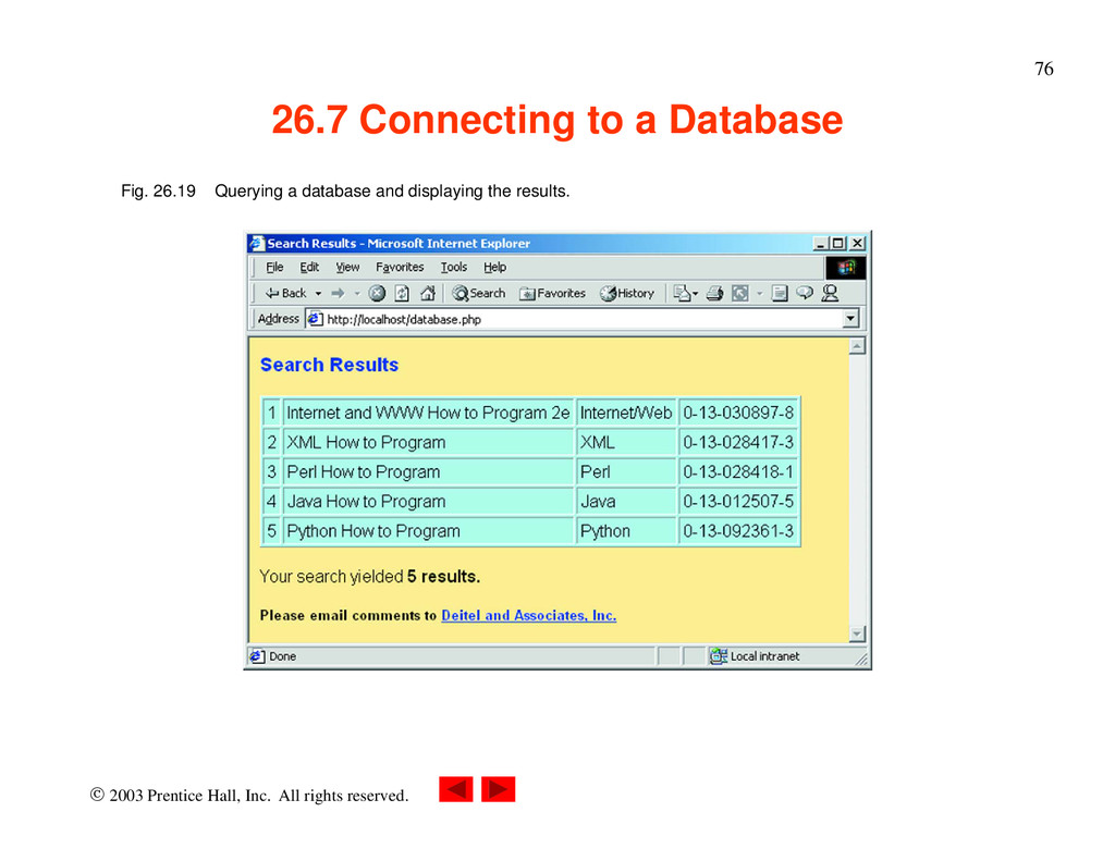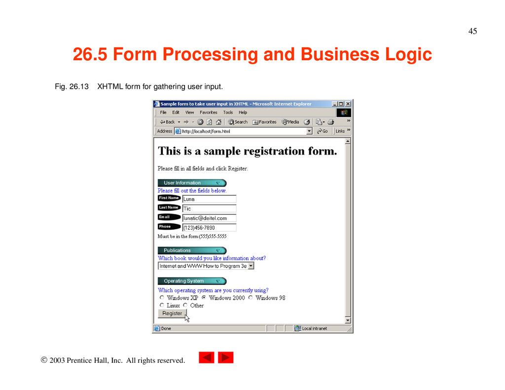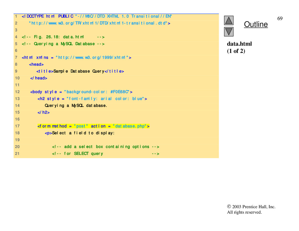47 if ( $email == "" ) { 48 $formerrors[ "emailerror" ] = true; 49 $iserror = true; 50 } 51 52 if ( !ereg( "^\([0-9]{3}\)[0-9]{3}-[0-9]{4}$", $phone ) ) { 53 $formerrors[ "phoneerror" ] = true; 54 $iserror = true; 55 } 56 57 if ( !$iserror ) { 58 59 // build INSERT query 60 $query = "INSERT INTO contacts " . 61 "( LastName, FirstName, Email, Phone, Book, OS ) " . 62 "VALUES ( '$lname', '$fname', '$email', " . 63 "'" . quotemeta( $phone ) . "', '$book', '$os' )"; 64 65 // Connect to MySQL 66 if ( !( $database = mysql_connect( "localhost", 67 "httpd", "" ) ) ) 68 die( "Could not connect to database" ); 69 70 // open MailingList database 71 if ( !mysql_select_db( "MailingList", $database ) ) 72 die( "Could not open MailingList database" ); dynamicForm.php (3 of 9) If there were no errors, query the MySQL database.