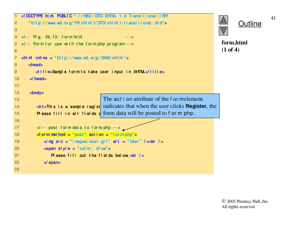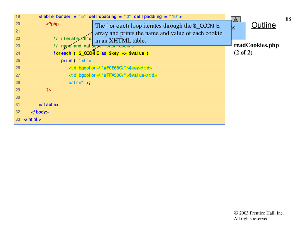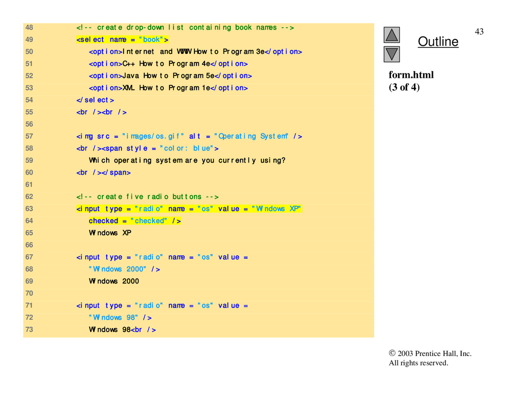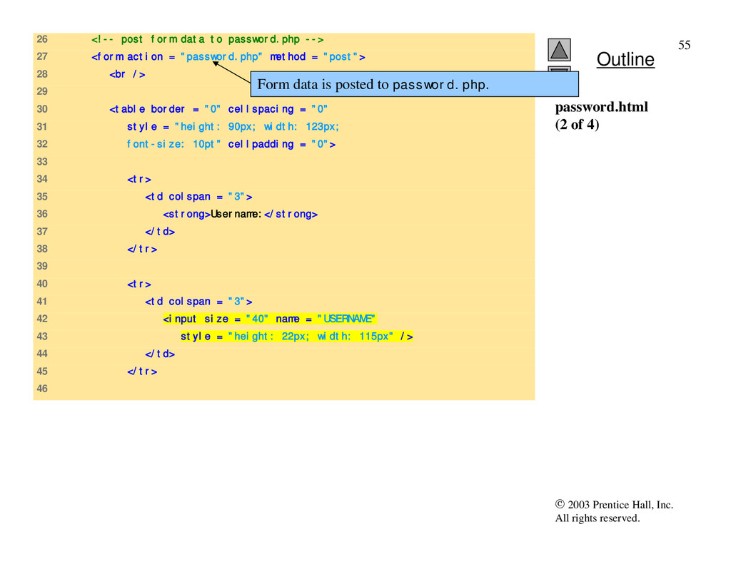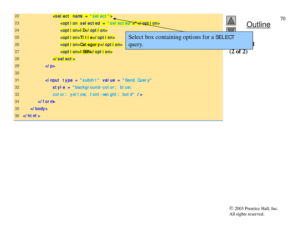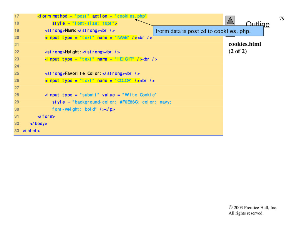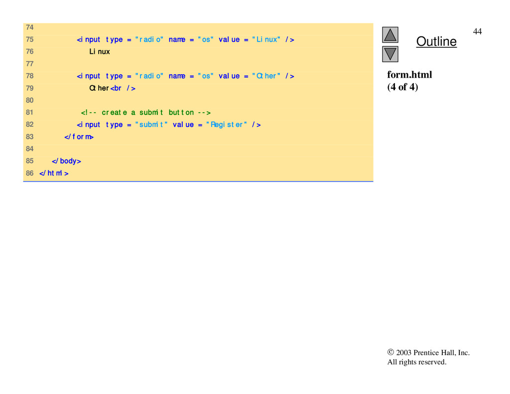 47 if ( $email == "" ) { 48 $formerrors[ "emailerror" ] = true; 49 $iserror = true; 50 } 51 52 if ( !ereg( "^\([0-9]{3}\)[0-9]{3}-[0-9]{4}$", $phone ) ) { 53 $formerrors[ "phoneerror" ] = true; 54 $iserror = true; 55 } 56 57 if ( !$iserror ) { 58 59 // build INSERT query 60 $query = "INSERT INTO contacts " . 61 "( LastName, FirstName, Email, Phone, Book, OS ) " . 62 "VALUES ( '$lname', '$fname', '$email', " . 63 "'" . quotemeta( $phone ) . "', '$book', '$os' )"; 64 65 // Connect to MySQL 66 if ( !( $database = mysql_connect( "localhost", 67 "httpd", "" ) ) ) 68 die( "Could not connect to database" ); 69 70 // open MailingList database 71 if ( !mysql_select_db( "MailingList", $database ) ) 72 die( "Could not open MailingList database" ); dynamicForm.php (3 of 9) If there were no errors, query the MySQL database.