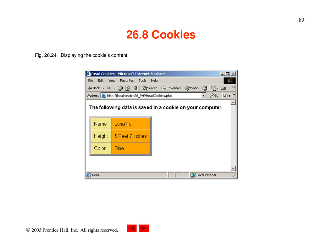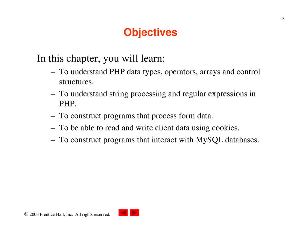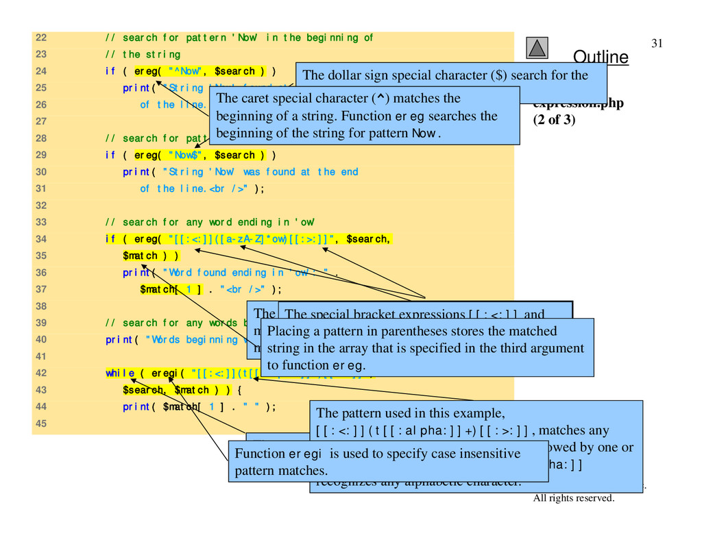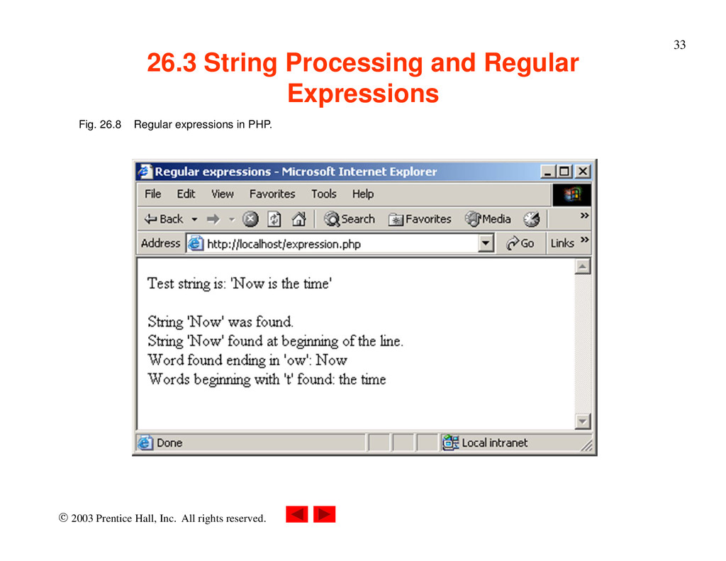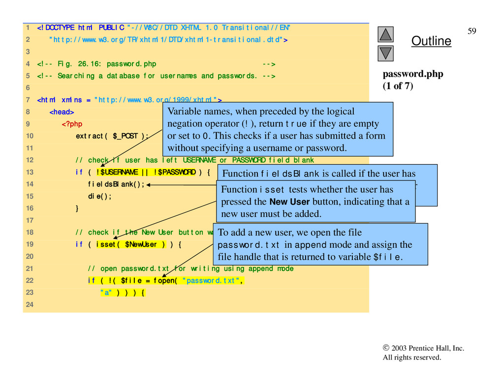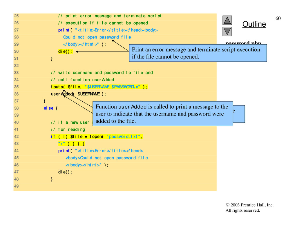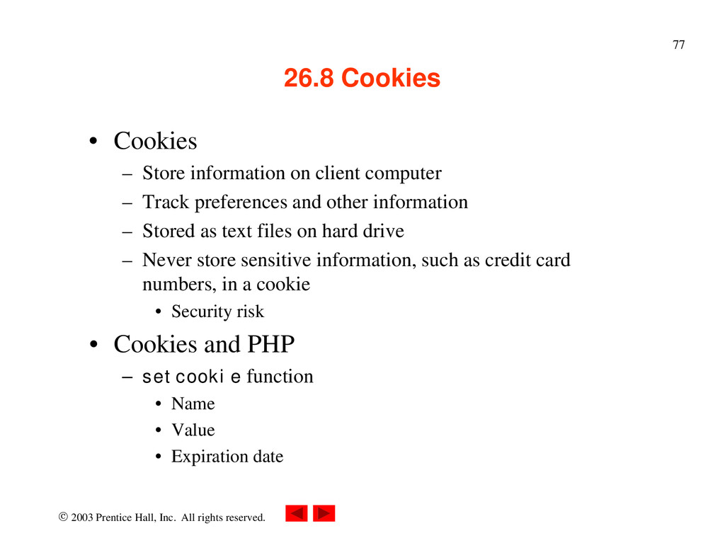 47 if ( $email == "" ) { 48 $formerrors[ "emailerror" ] = true; 49 $iserror = true; 50 } 51 52 if ( !ereg( "^\([0-9]{3}\)[0-9]{3}-[0-9]{4}$", $phone ) ) { 53 $formerrors[ "phoneerror" ] = true; 54 $iserror = true; 55 } 56 57 if ( !$iserror ) { 58 59 // build INSERT query 60 $query = "INSERT INTO contacts " . 61 "( LastName, FirstName, Email, Phone, Book, OS ) " . 62 "VALUES ( '$lname', '$fname', '$email', " . 63 "'" . quotemeta( $phone ) . "', '$book', '$os' )"; 64 65 // Connect to MySQL 66 if ( !( $database = mysql_connect( "localhost", 67 "httpd", "" ) ) ) 68 die( "Could not connect to database" ); 69 70 // open MailingList database 71 if ( !mysql_select_db( "MailingList", $database ) ) 72 die( "Could not open MailingList database" ); dynamicForm.php (3 of 9) If there were no errors, query the MySQL database.