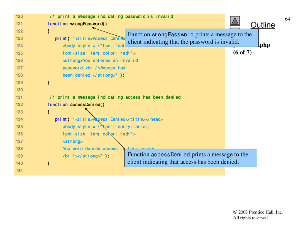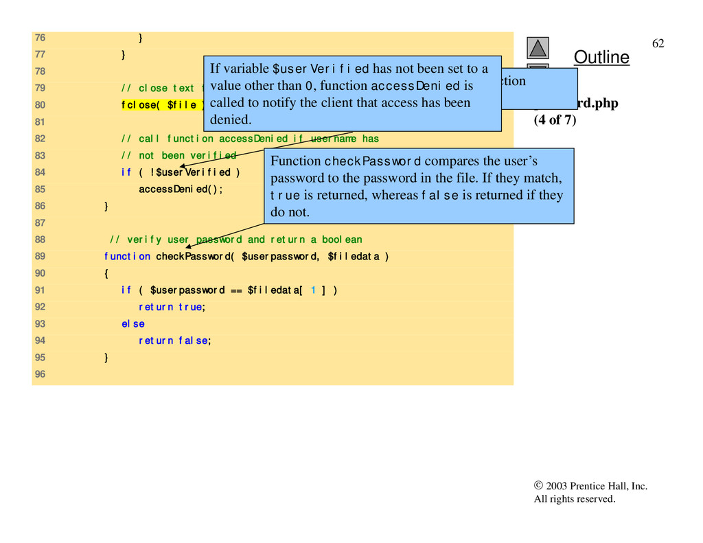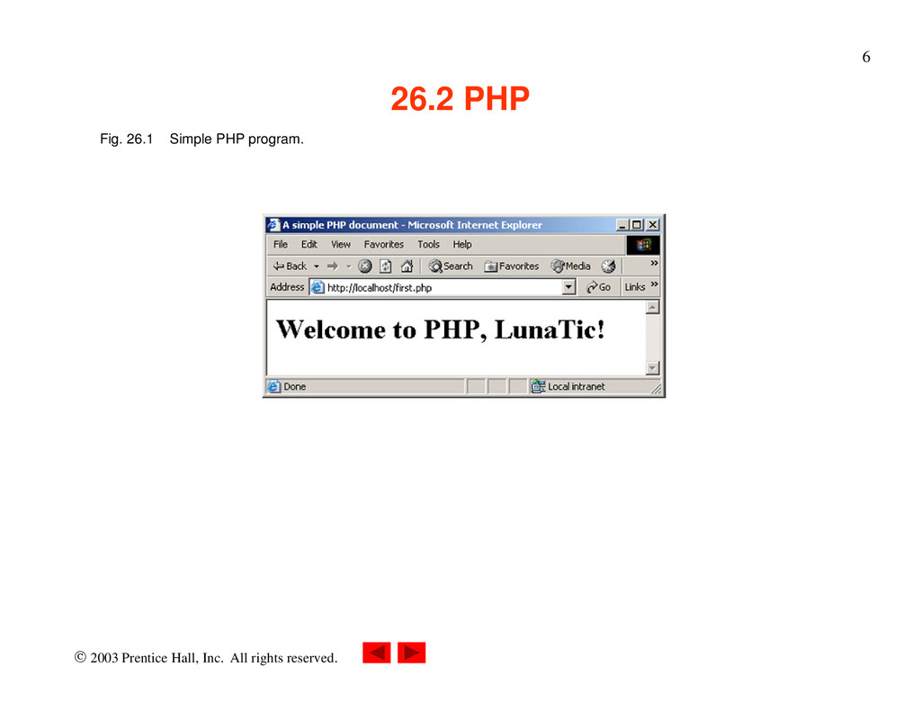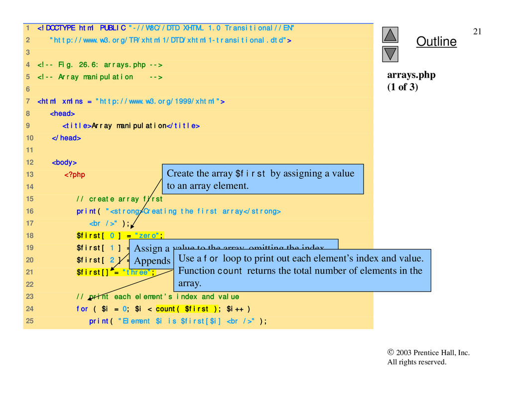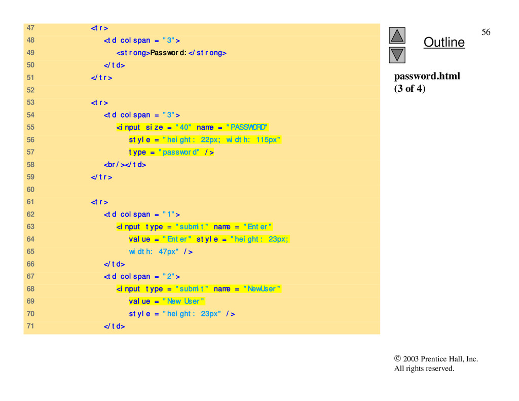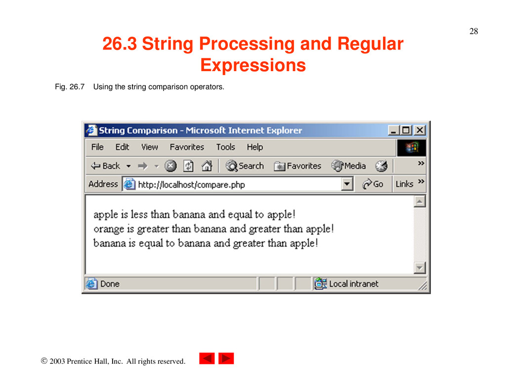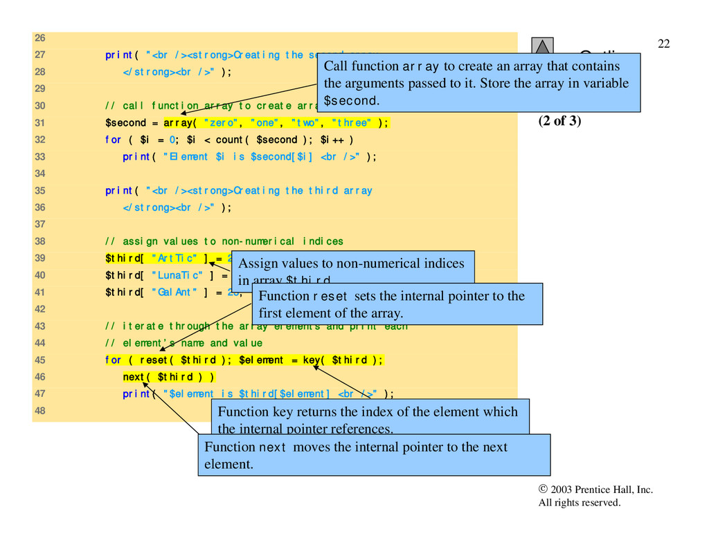 47 if ( $email == "" ) { 48 $formerrors[ "emailerror" ] = true; 49 $iserror = true; 50 } 51 52 if ( !ereg( "^\([0-9]{3}\)[0-9]{3}-[0-9]{4}$", $phone ) ) { 53 $formerrors[ "phoneerror" ] = true; 54 $iserror = true; 55 } 56 57 if ( !$iserror ) { 58 59 // build INSERT query 60 $query = "INSERT INTO contacts " . 61 "( LastName, FirstName, Email, Phone, Book, OS ) " . 62 "VALUES ( '$lname', '$fname', '$email', " . 63 "'" . quotemeta( $phone ) . "', '$book', '$os' )"; 64 65 // Connect to MySQL 66 if ( !( $database = mysql_connect( "localhost", 67 "httpd", "" ) ) ) 68 die( "Could not connect to database" ); 69 70 // open MailingList database 71 if ( !mysql_select_db( "MailingList", $database ) ) 72 die( "Could not open MailingList database" ); dynamicForm.php (3 of 9) If there were no errors, query the MySQL database.