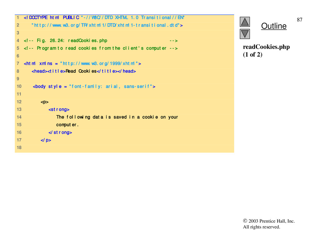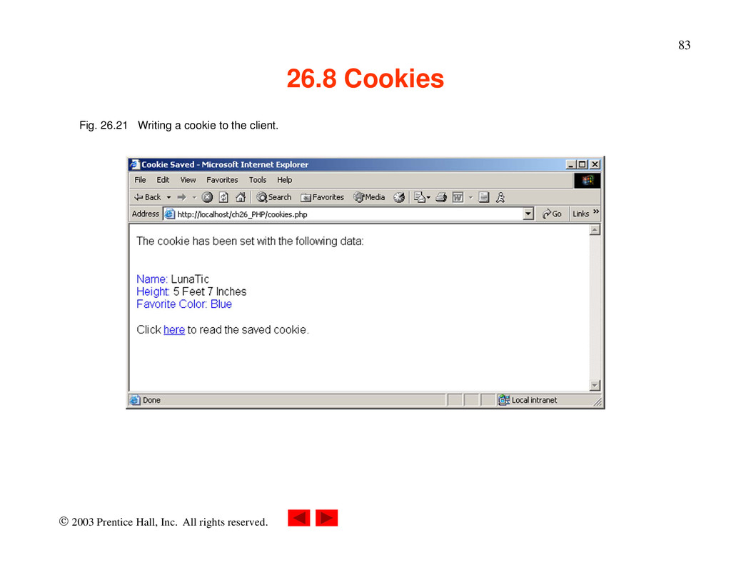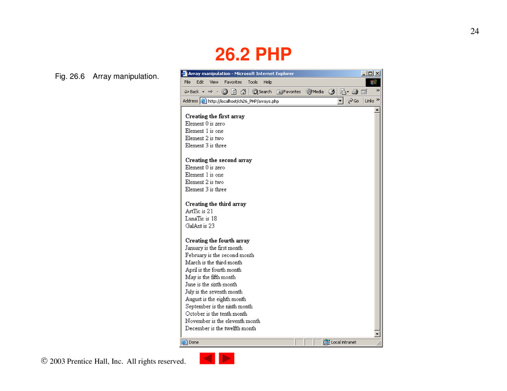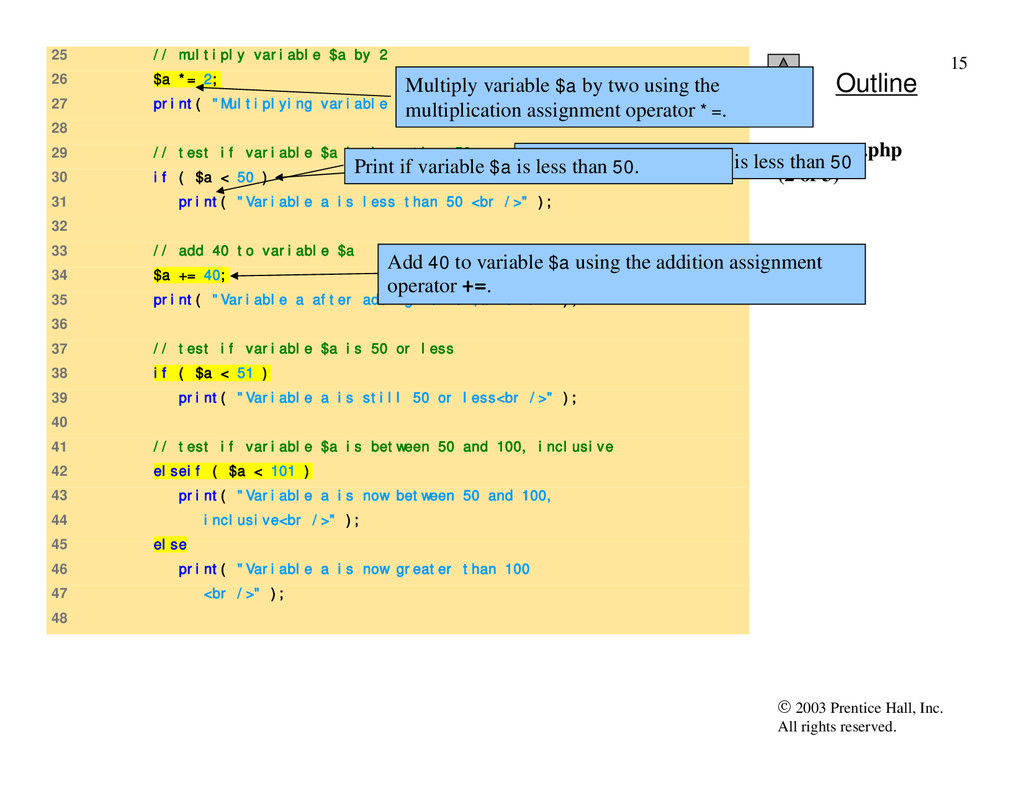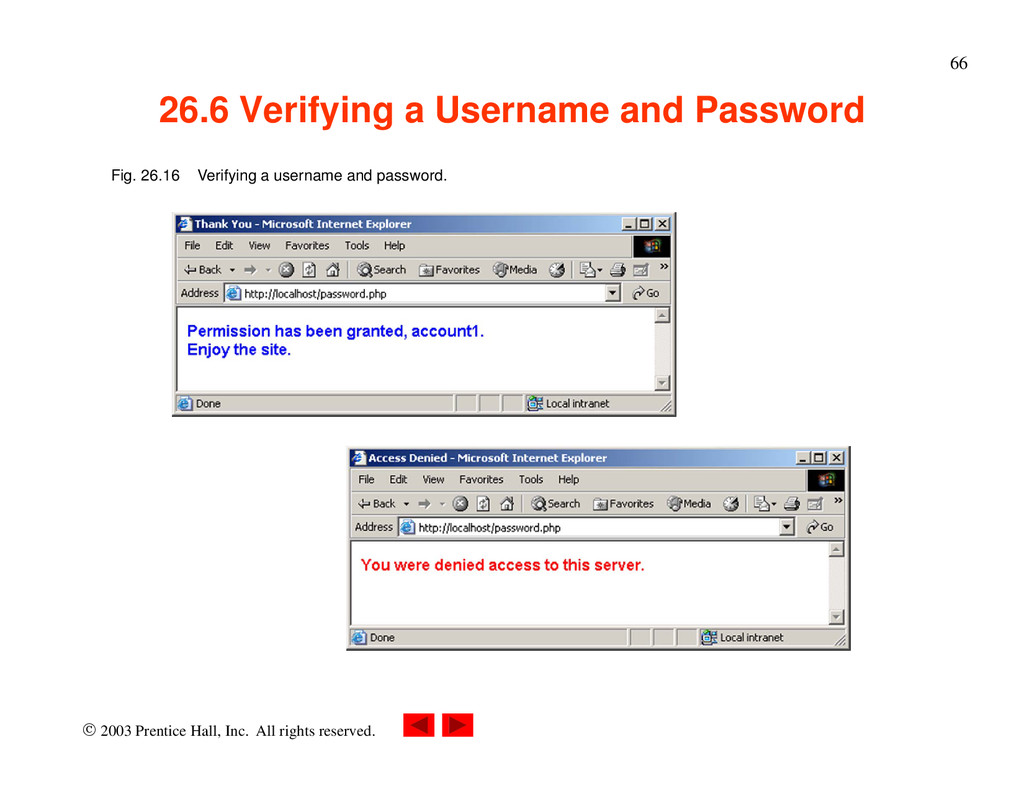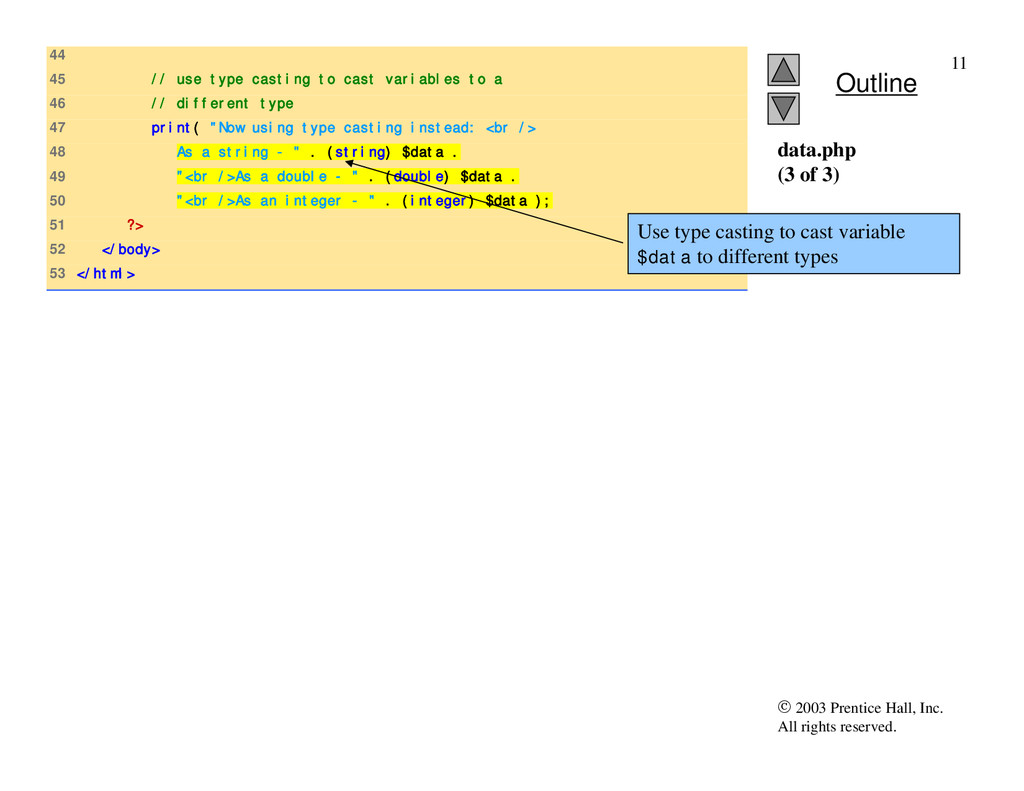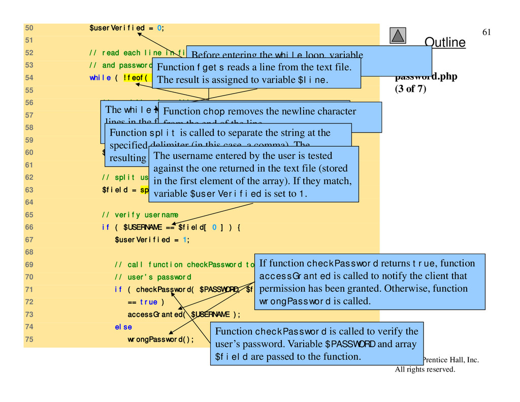 47 if ( $email == "" ) { 48 $formerrors[ "emailerror" ] = true; 49 $iserror = true; 50 } 51 52 if ( !ereg( "^\([0-9]{3}\)[0-9]{3}-[0-9]{4}$", $phone ) ) { 53 $formerrors[ "phoneerror" ] = true; 54 $iserror = true; 55 } 56 57 if ( !$iserror ) { 58 59 // build INSERT query 60 $query = "INSERT INTO contacts " . 61 "( LastName, FirstName, Email, Phone, Book, OS ) " . 62 "VALUES ( '$lname', '$fname', '$email', " . 63 "'" . quotemeta( $phone ) . "', '$book', '$os' )"; 64 65 // Connect to MySQL 66 if ( !( $database = mysql_connect( "localhost", 67 "httpd", "" ) ) ) 68 die( "Could not connect to database" ); 69 70 // open MailingList database 71 if ( !mysql_select_db( "MailingList", $database ) ) 72 die( "Could not open MailingList database" ); dynamicForm.php (3 of 9) If there were no errors, query the MySQL database.