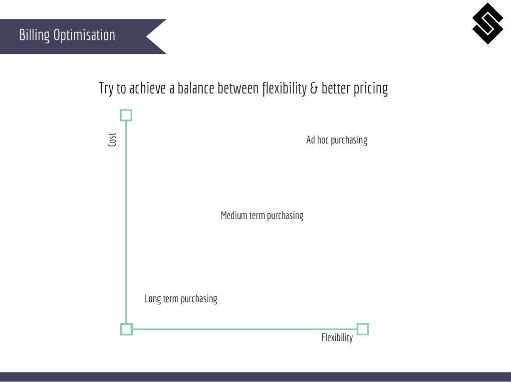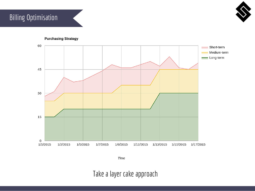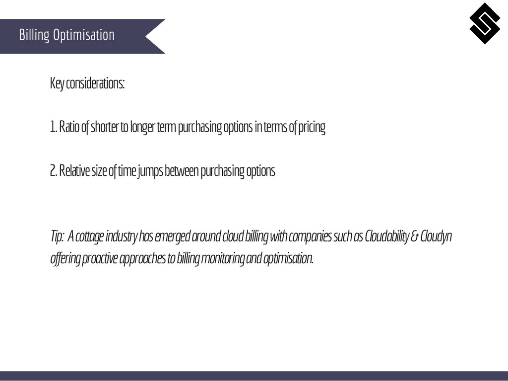term purchasing options in terms of pricing 2. Relative size of time jumps between purchasing options Tip: A cottage industry has emerged around cloud billing with companies such as Cloudability & Cloudyn offering proactive approaches to billing monitoring and optimisation.