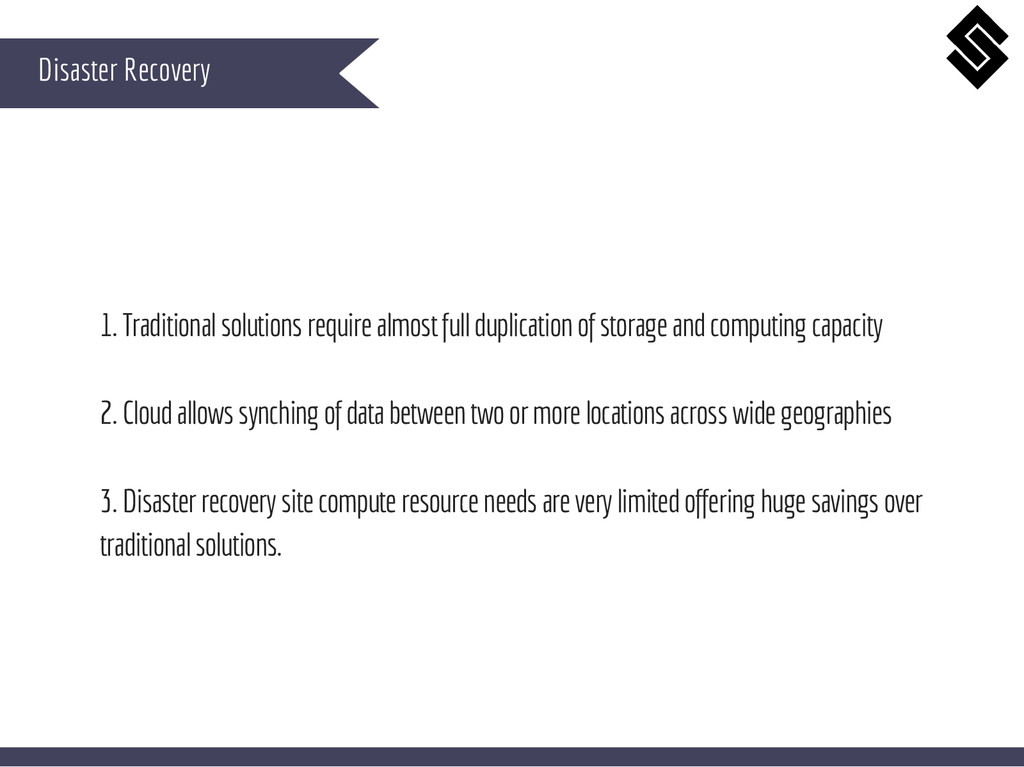 storage and computing capacity 2. Cloud allows synching of data between two or more locations across wide geographies 3. Disaster recovery site compute resource needs are very limited offering huge savings over traditional solutions.