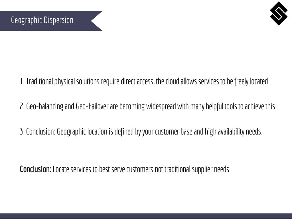 cloud allows services to be freely located 2. Geo-balancing and Geo-Failover are becoming widespread with many helpful tools to achieve this 3. Conclusion: Geographic location is defined by your customer base and high availability needs. Conclusion: Locate services to best serve customers not traditional supplier needs