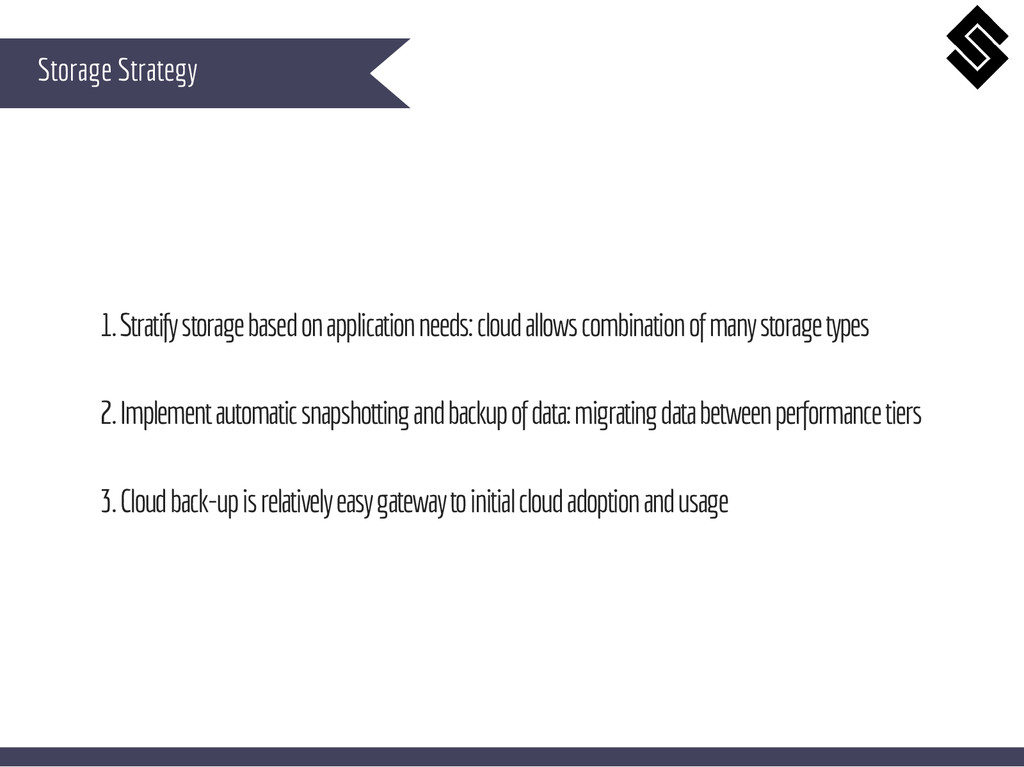allows combination of many storage types 2. Implement automatic snapshotting and backup of data: migrating data between performance tiers 3. Cloud back-up is relatively easy gateway to initial cloud adoption and usage