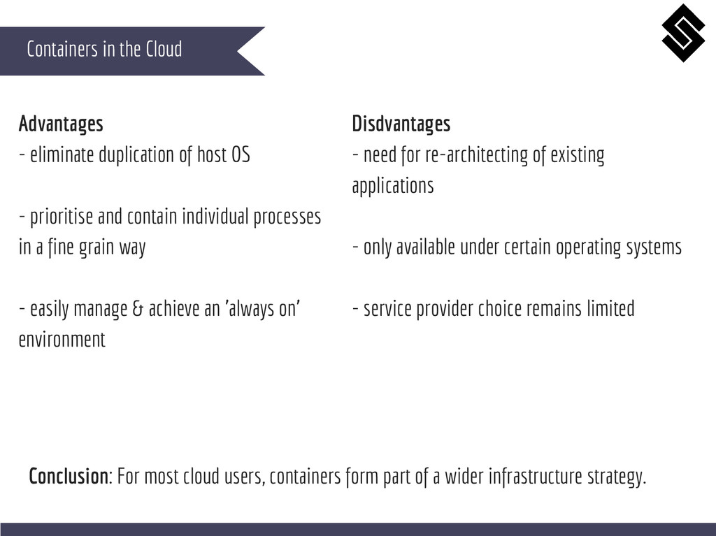 form part of a wider infrastructure strategy. Advantages - eliminate duplication of host OS - prioritise and contain individual processes in a fine grain way - easily manage & achieve an 'always on' environment Disdvantages - need for re-architecting of existing applications - only available under certain operating systems - service provider choice remains limited