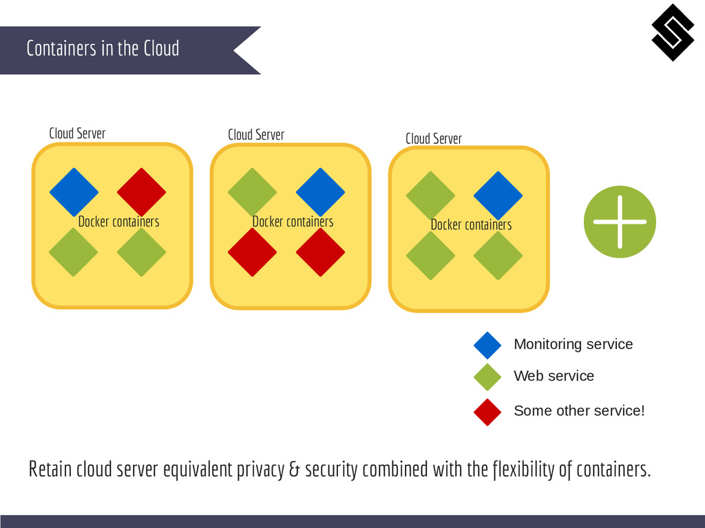 security combined with the flexibility of containers. Docker containers Docker containers Cloud Server Cloud Server Docker containers Cloud Server Monitoring service Web service Some other service!