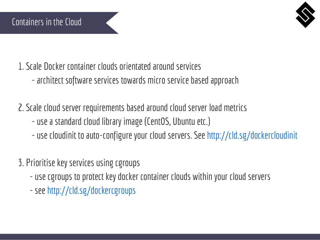 around services - architect software services towards micro service based approach 2. Scale cloud server requirements based around cloud server load metrics - use a standard cloud library image (CentOS, Ubuntu etc.) - use cloudinit to auto-configure your cloud servers. See http://cld.sg/dockercloudinit 3. Prioritise key services using cgroups - use cgroups to protect key docker container clouds within your cloud servers - see http://cld.sg/dockercgroups