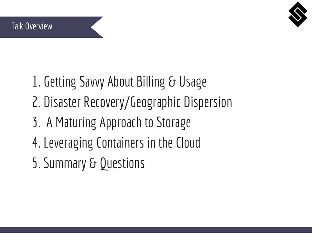 Savvy About Billing & Usage 2. Disaster Recovery/Geographic Dispersion 3. A Maturing Approach to Storage 4. Leveraging Containers in the Cloud 5. Summary & Questions