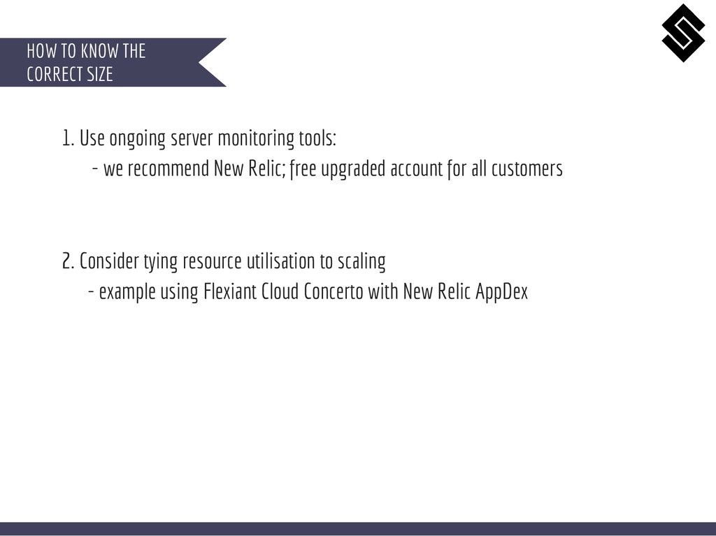 monitoring tools: - we recommend New Relic; free upgraded account for all customers 2. Consider tying resource utilisation to scaling - example using Flexiant Cloud Concerto with New Relic AppDex