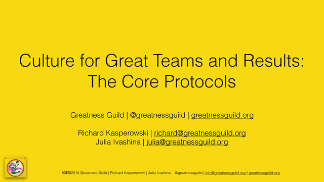 In this presentation, Richard Kasperowski and Julia Ivashina introduce the Core Protocols. They share the fundamentals of the Core Protocols and guide attendees through activities that help them learn and retain these same successful behavior patterns. You’ll leave understanding of how to build a team that is in a state of shared vision and can deliver great products on time every time.