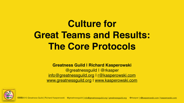 greatnessguild.org @rkasper | [email protected] | kasperowski.com Culture for Great Teams and Results: The Core Protocols Greatness Guild | Richard Kasperowski @greatnessguild | @rkasper [email protected] | [email protected] www.greatnessguild.org | www.kasperowski.com
