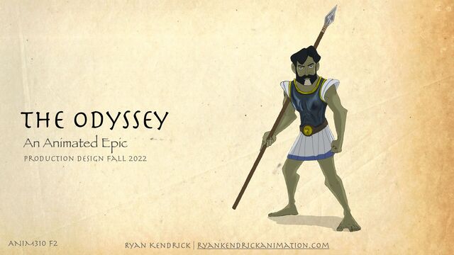 King Alcinous Leaves the shores of T roy with his fl eet to return home to Ithaca Raids a near by town, loses a couple of men in the raid Arrives at the Isle of the Lotus Eaters Arrives at Polyphemus’s Island. Is captured then blinds the cyclops. Is cursed to never reach home unless all his comrades die along the way Meets Aeolus and is gifted a bag of winds Almost at Ithaca when his men release the winds, blowing them off course Begs Aeolus for aid again. Is denied Fleet is destroyed by the Laestrygonians (giants) Arrives at Circe’s Island. Men are turned into animals, Helped by Hermes and they stay for 1 year Voyage to the land of the dead. Meets ghosts of his Mother, Achilles, and Agamemnon. Encounters Persephone Spends the night on Circe’s Island. Is warned of the Sirens, Wandering Rocks and Scylla and Charybdis Passes the Sirens Choses the straights and loses 6 men to Scylla Stranded on Hyperion’s Island. Forced to eat forbidden cattle and sheep Zeus Destroys his ship killing the rest of his crew and leaving him stranded at sea. Faces Charybdis alone Washes up on Calypso’s island and is held prisoner for 7 years Builds boat and sails back to Ithaca, Poseidon wrecks his boat and is washed up of Phaeacia. Phaeacians offer him a ride to Ithaca. Abandon him on the shores. Polyphemus’s curse his lifted Athena visits him and disguises him as a beggar. Stays with his former Swineherd. Reunites with his son and plots to over throw the suitors that have disgraced his home. Penelope holds archery contest for the suitors to win her hand in marriage. None of them succeed. She retires and Odysseus reveals himself Odysseus and his son slaughter the suitors T owns people try to take revenge for their slain sons and brothers, Zeus and Athena put an end to the riot Ryan Kendrick | ryankendrickanimation.com ANIM310 F2