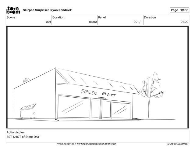 01 00 Action Notes CUT to MEDIUM SHOT of CART in front of SM Slurpee Surprise! Ryan Kendrick Page 150/163 Slurpee Surprise! Ryan Kendrick | www.ryankendrickanimation.com