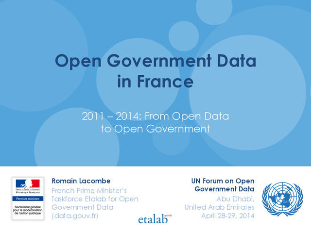 Data to Open Government Romain Lacombe French Prime Minister’s Taskforce Etalab for Open Government Data (data.gouv.fr) UN Forum on Open Government Data Abu Dhabi, United Arab Emirates April 28-29, 2014