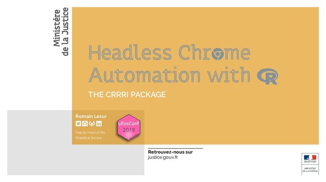 p. 19 {crrri} package Conclusion only one dependency: Chrome Java, Node or a server are not required easy to use with Travis or Docker integrates well with RStudio 1.2 just update Chrome to get the latest features flexible: define your own flow compatible with Shiny (because of the {promises} package) orchestrate headless Chrome in your Shiny app! Pros low-level interface: Chrome DevTools Protocol is highly technical mostly dedicated to R developers/hackers Cons