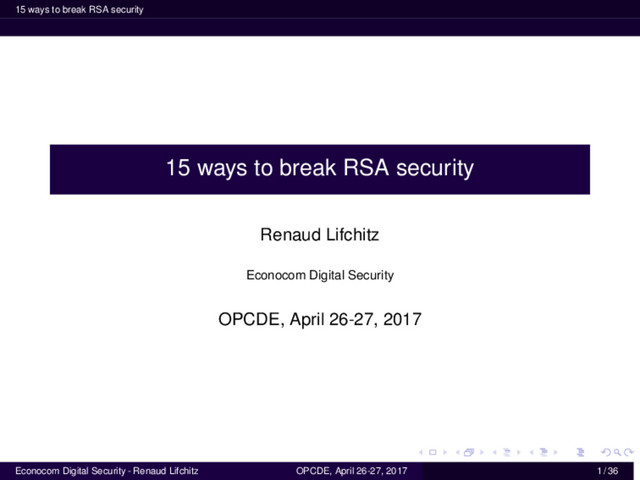 We will do a research state of the art talk presenting as many as possible ways to attack RSA algorithm (encryption and signature cryptosystems), some of them being very new (discovered or implemented in the last few years). We will also show real computing demos with simple tools. The goal is NOT to explain all the math behind.