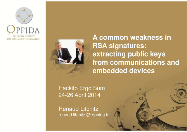 This talk will show a very common weakness in RSA signatures. We will be able to computationally extract public RSA keys from communications and embedded systems in case the public key is voluntarily not published. This weakens RSA signatures where keys of small sizes and/or quality are used and allows direct factoring attacks. 2 studies will be conducted on PGP/GPG e-mails and on the Vigik access control system which protects access to nearly 1 million buildings in France.