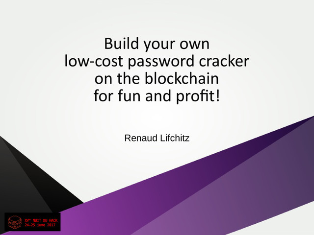 This innovative talk will mix DIY, emerging technologies and computer security. First part of the talk will explain how to build your own low-cost, powerful, totally silent and ecological password cracker using a cheap and publicly available FPGA board, with an introduction to FPGA programming for that purpose. Second part will deal about building a collaborative marketplace where everybody can share uncracked password hashes and give a reward for the solutions, and where people can help providing solutions to get those rewards in a completely decentralized way, by developing and using a smart contract on the Ethereum blockchain.