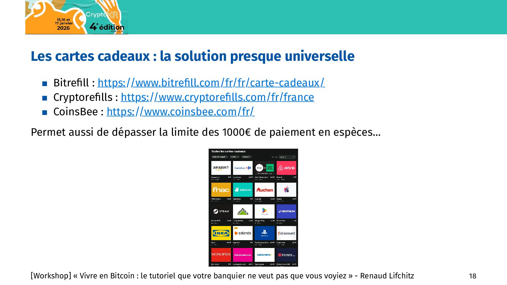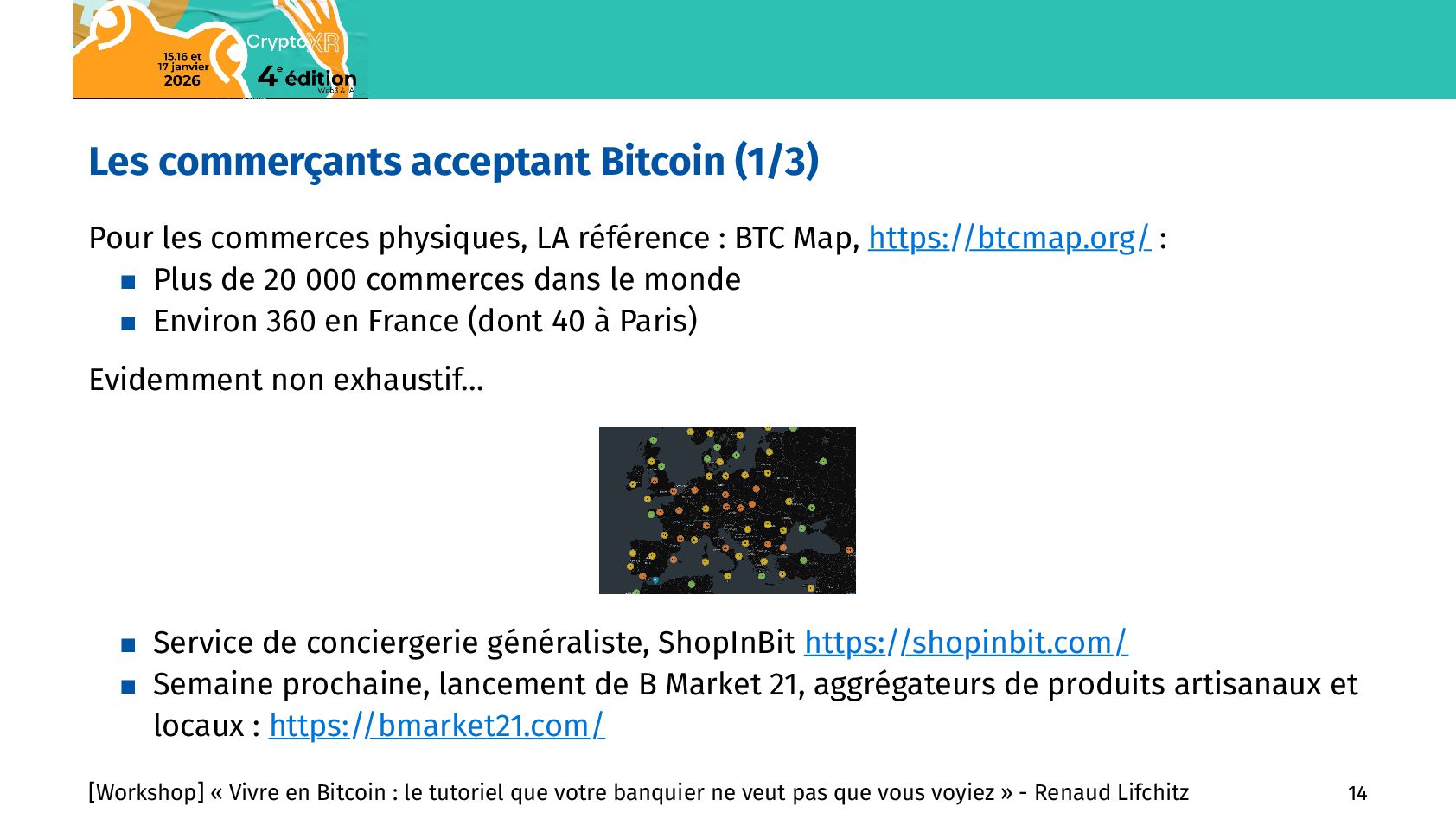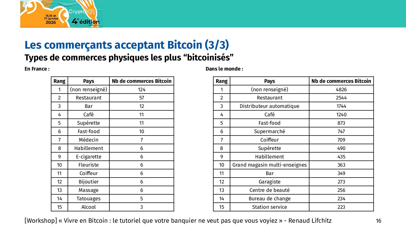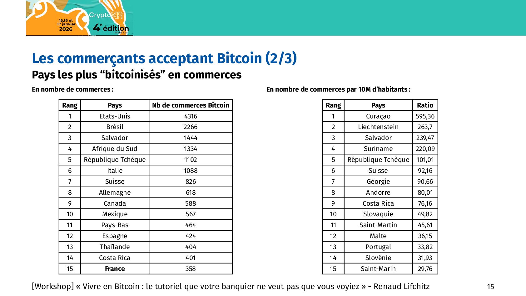 commerces En nombre de commerces : Rang Pays Nb de commerces Bitcoin 1 Etats-Unis 4316 2 Brésil 2266 3 Salvador 1444 4 Afrique du Sud 1334 5 République Tchèque 1102 6 Italie 1088 7 Suisse 826 8 Allemagne 618 9 Canada 588 10 Mexique 567 11 Pays-Bas 464 12 Espagne 424 13 Thaïlande 404 14 Costa Rica 401 15 France 358 En nombre de commerces par 10M d’habitants : Rang Pays Ratio 1 Curaçao 595,36 2 Liechtenstein 263,7 3 Salvador 239,47 4 Suriname 220,09 5 République Tchèque 101,01 6 Suisse 92,16 7 Géorgie 90,66 8 Andorre 80,01 9 Costa Rica 76,16 10 Slovaquie 49,82 11 Saint-Martin 45,61 12 Malte 36,15 13 Portugal 33,82 14 Slovénie 31,93 15 Saint-Marin 29,76 [Workshop] « Vivre en Bitcoin : le tutoriel que votre banquier ne veut pas que vous voyiez » - Renaud Lifchitz 15