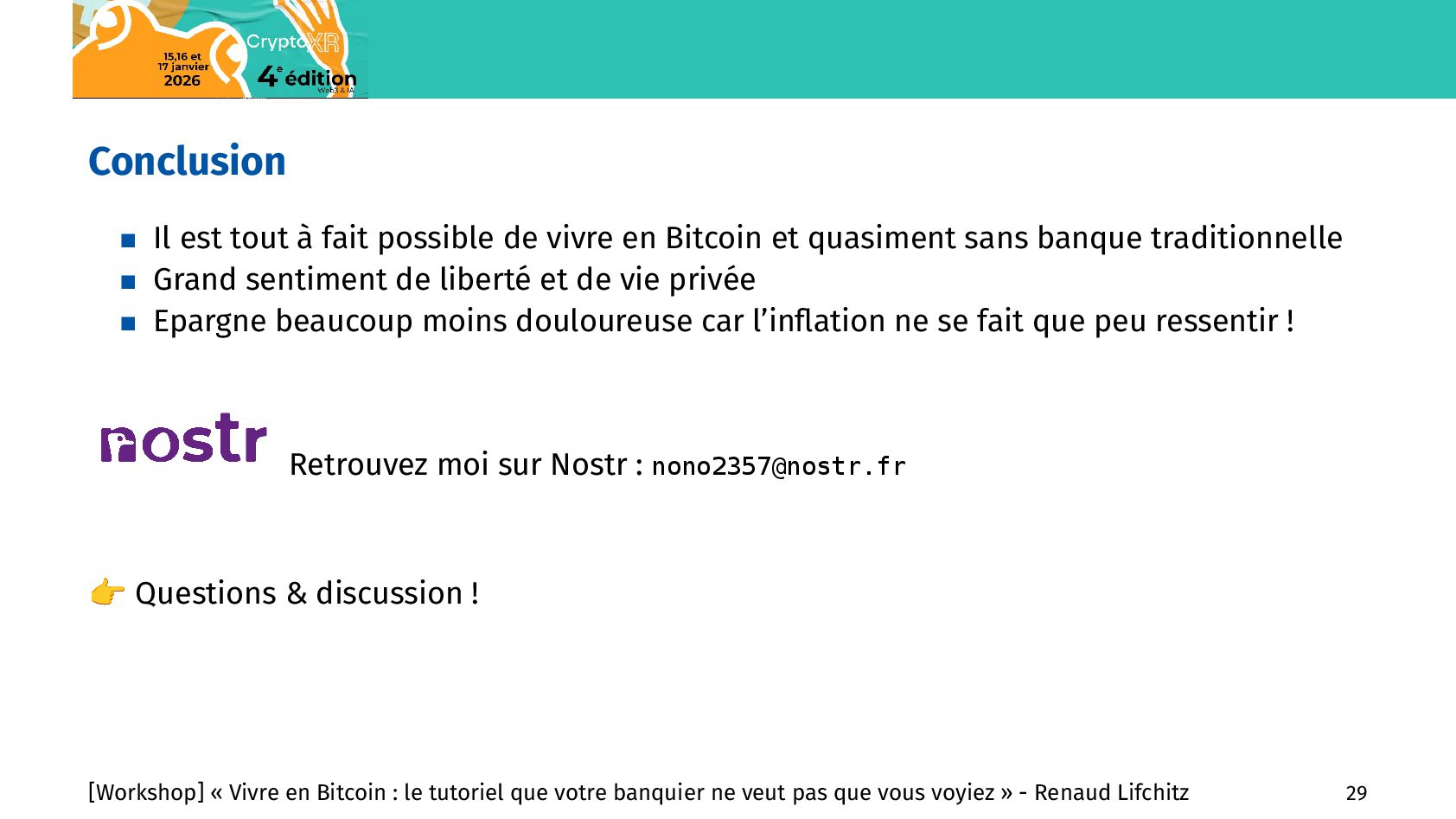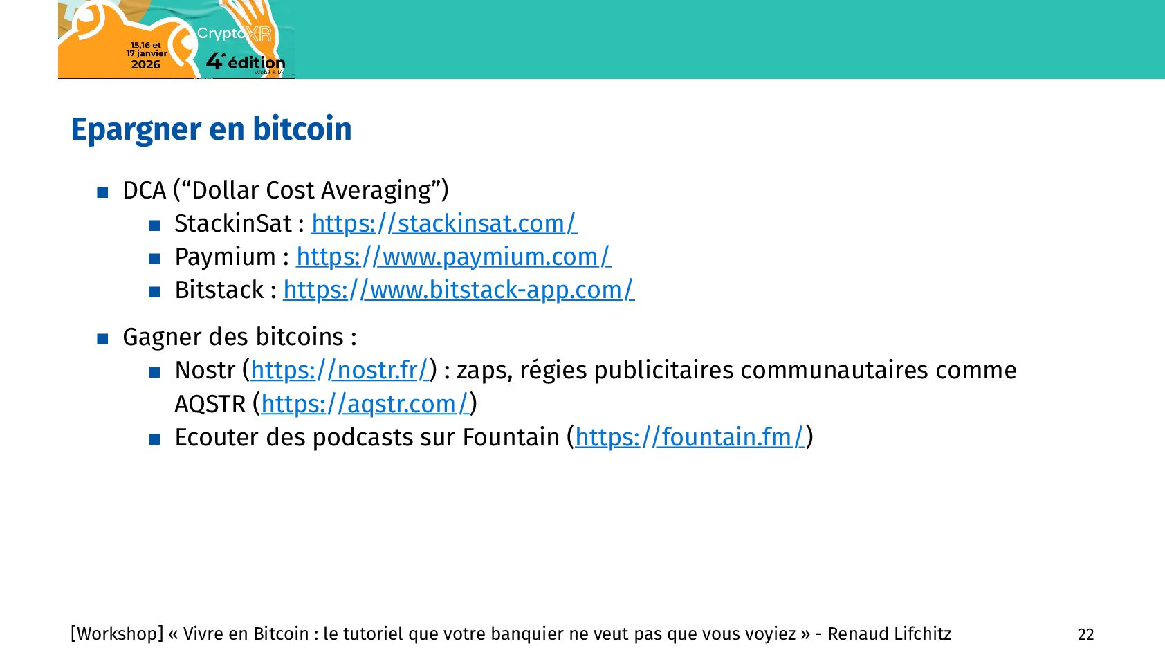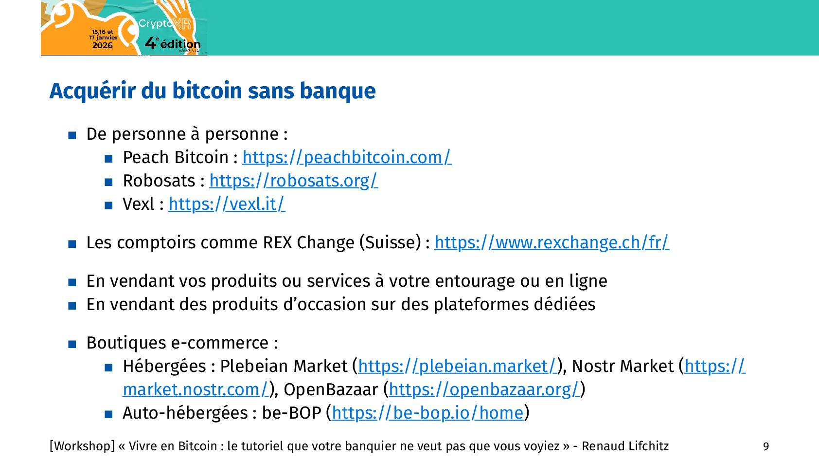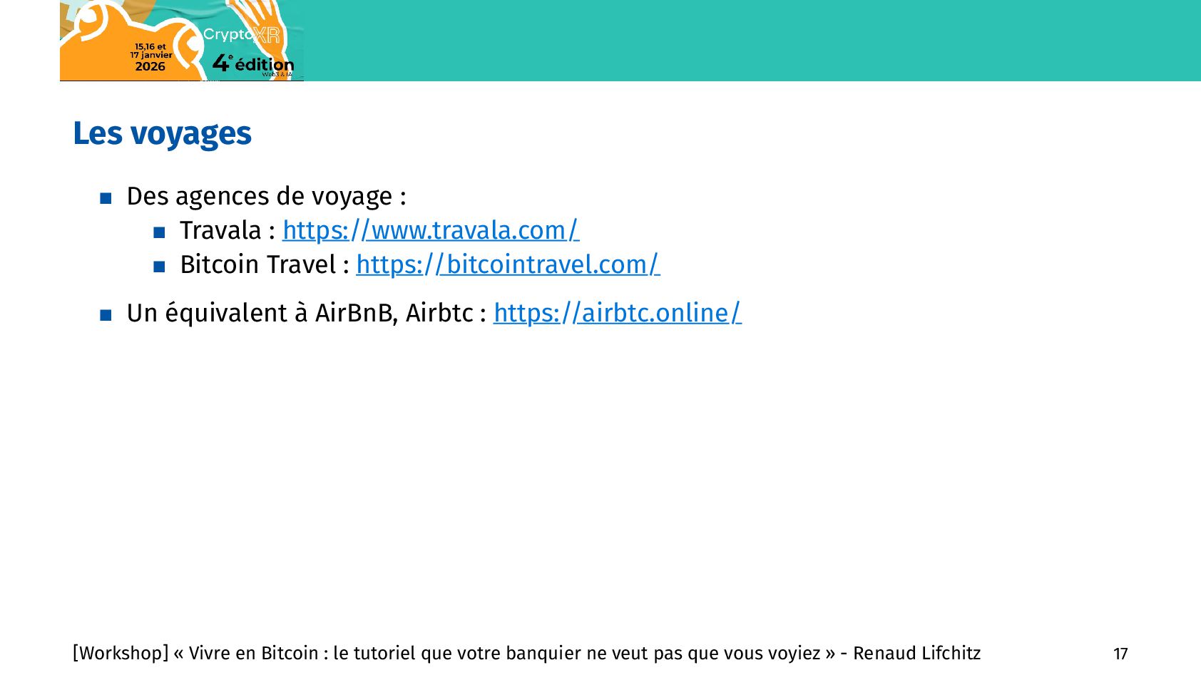 commerces En nombre de commerces : Rang Pays Nb de commerces Bitcoin 1 Etats-Unis 4316 2 Brésil 2266 3 Salvador 1444 4 Afrique du Sud 1334 5 République Tchèque 1102 6 Italie 1088 7 Suisse 826 8 Allemagne 618 9 Canada 588 10 Mexique 567 11 Pays-Bas 464 12 Espagne 424 13 Thaïlande 404 14 Costa Rica 401 15 France 358 En nombre de commerces par 10M d’habitants : Rang Pays Ratio 1 Curaçao 595,36 2 Liechtenstein 263,7 3 Salvador 239,47 4 Suriname 220,09 5 République Tchèque 101,01 6 Suisse 92,16 7 Géorgie 90,66 8 Andorre 80,01 9 Costa Rica 76,16 10 Slovaquie 49,82 11 Saint-Martin 45,61 12 Malte 36,15 13 Portugal 33,82 14 Slovénie 31,93 15 Saint-Marin 29,76 [Workshop] « Vivre en Bitcoin : le tutoriel que votre banquier ne veut pas que vous voyiez » - Renaud Lifchitz 15