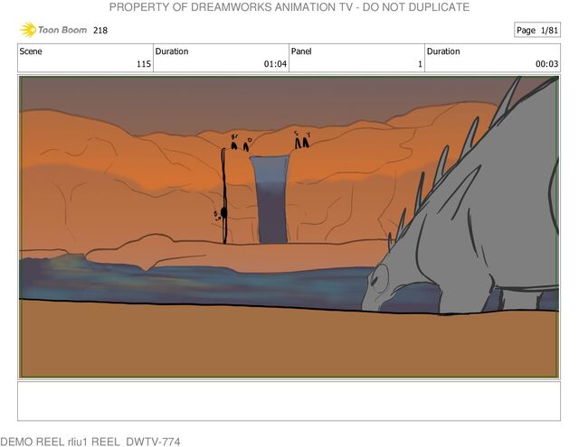 Great job Sammy. The dinos needed a place to chill, but so did we. 218 Page 15/81 PROPERTY OF DREAMWORKS ANIMATION TV - DO NOT DUPLICATE DEMO REEL rliu1 REEL_DWTV-774