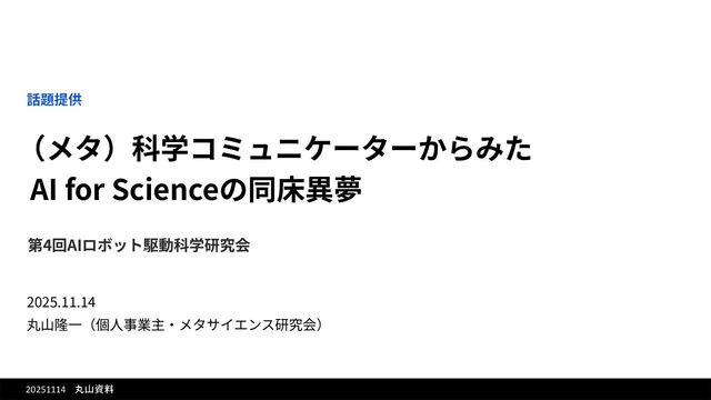Chen et al. (2025) AI4Research: A Survey of Artificial Intelligence for Scientific Research. https://arxiv.org/abs/2507.01903 • Wei et al. (2025) From AI for Science to Agentic Science: A Survey on Autonomous Scientific Discovery. https://arxiv.org/abs/2508.14111 • 嶋⽥‧丸⼭ (2023) 「基盤モデルとAI‧ロボット駆動科学」 https://www.mext.go.jp/content/20230620-mxt_kiso-000030314_3.pdf • National Academies of Sciences, Engineering, and Medicine (2022) Automated Research Workflows for Accelerated Discovery: Closing the Knowledge Discovery Loop https://www.nationalacademies.org/catalog/26532/ • DOE (2020) AI for Science Report 2020. https://www.anl.gov/ai/reference/ai-for-science-report-202 • European Commission (2023) AI in Science Policy Brief https://research-and-innovation.ec.europa.eu/research-area/industrial-research-and-innovation/artificial-intelligence-ai-science_en • European Commission (2025) Living guidelines on the responsible use of generative AI in research. https://research-and-innovation.ec.europa.eu/document/download/2b6cf7e5-36ac-41cb-aab5-0d32050143dc_en • Royal Society (2024) Science in the Age of AI. https://royalsociety.org/news-resources/projects/science-in-the-age-of-ai/ • ⽇本学術会議 (2021) 回答「研究DXの推進-特にオープンサイエンス、データ利活⽤推進の視点から-」 https://www.scj.go.jp/ja/info/kohyo/pdf/kohyo-25-k335.pdf • ⽂部科学省「第7期科学技術‧イノベーション基本計画に向けた政府及び⽂部科学省の検討状況について」 https://www.mext.go.jp/content/20250805-mxt_jyohoka01-000044376_03.pdf • Google DeepMind (2023) A New Golden Age of Discovery. • Kitano, H. (2021) Nobel Turing Challenge: creating the engine for scientific discovery. npj Systems Biology and Applications 7, 29 https://doi.org/10.1038/s41540-021-00189-3 • Ribeiro, B. et al. (2023) The digitalisation paradox of everyday scientific labour … Research Policy 52(1): 104607 • Messeri, L., Crockett, M.J. (2024) Artificial intelligence and illusions of understanding in scientific research. Nature 627, 49‒58 • Kapoor, S., Narayanan, A. (2025) Could AI slow science? https://www.aisnakeoil.com/p/could-ai-slow-science