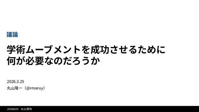 20260325 丸山資料 2026.3.25 丸⼭隆⼀(@rmaruy) 議論 学術ムーブメントを成功させるために 何が必要なのだろうか