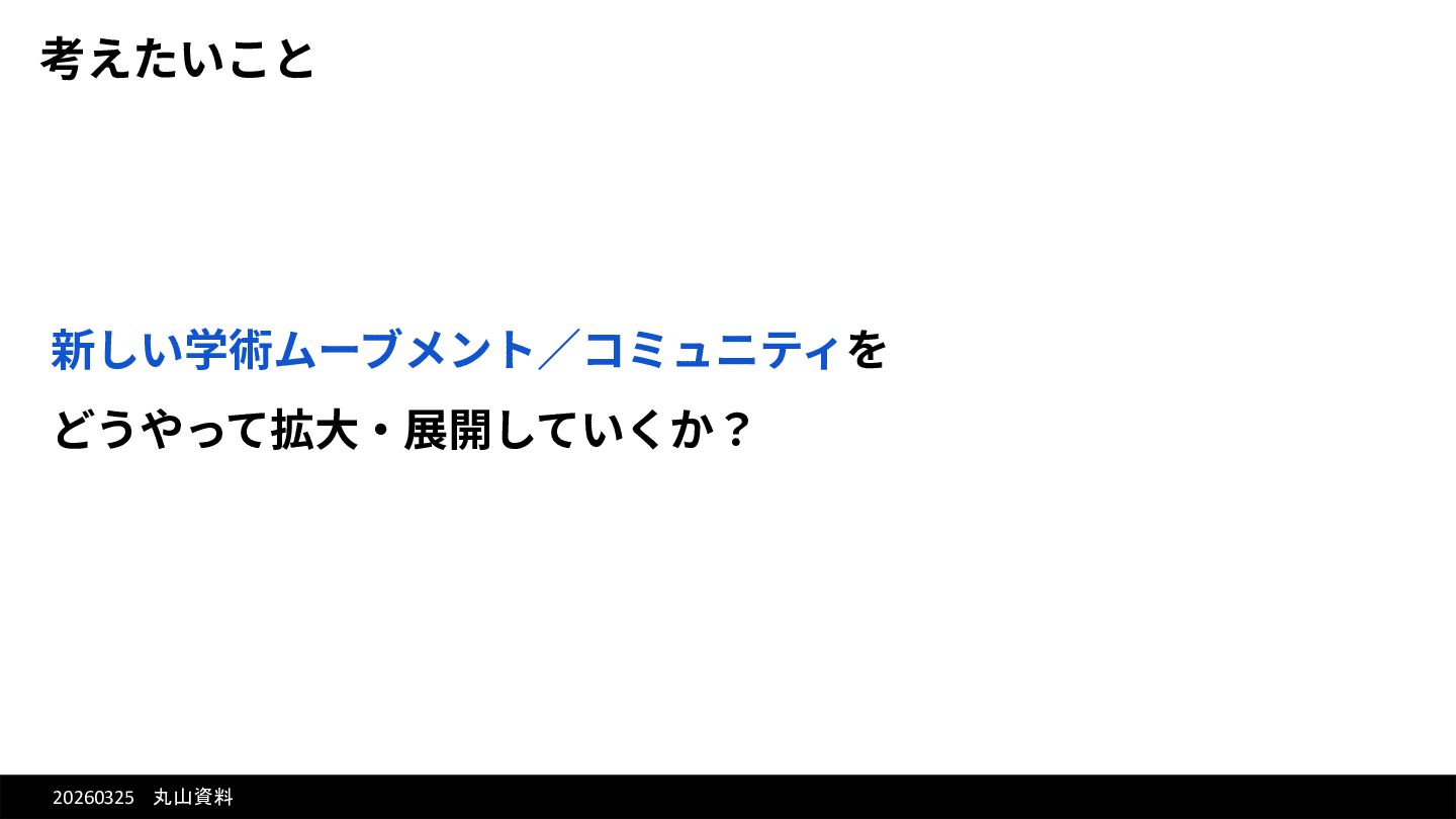 20260325 丸山資料 考えたいこと 新しい学術ムーブメント∕コミュニティを どうやって拡⼤‧展開していくか?