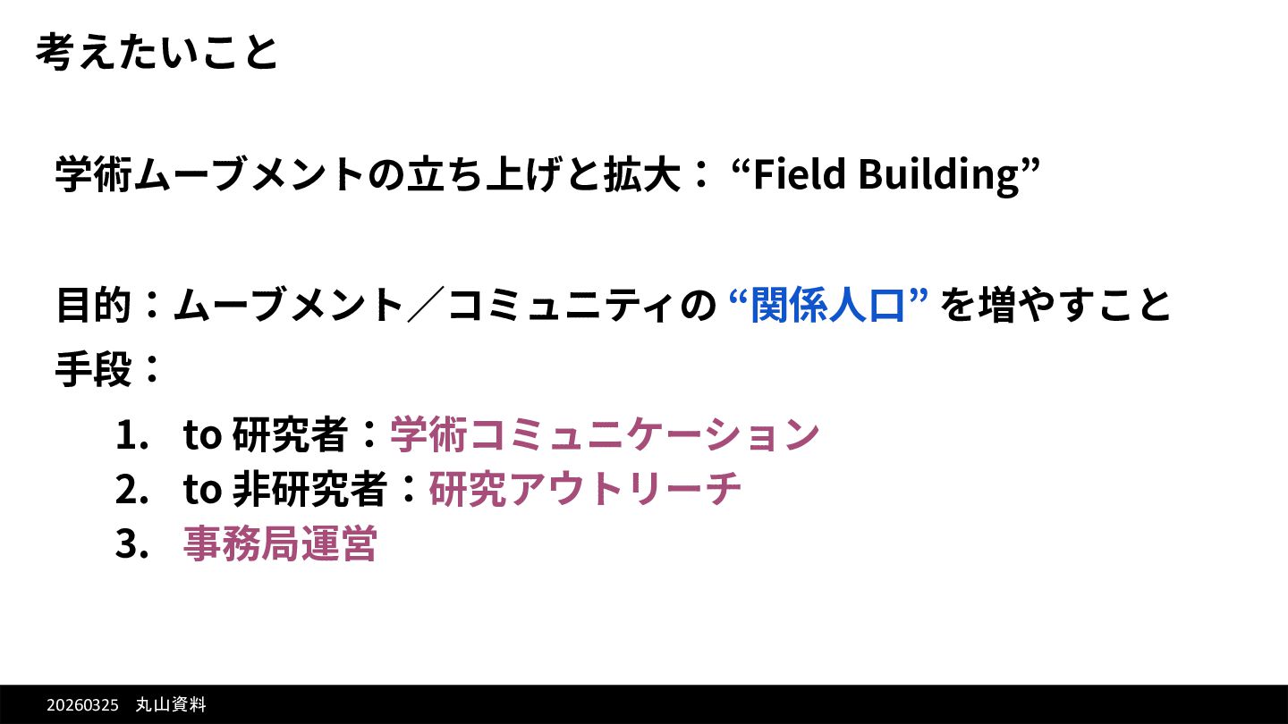 20260325 丸山資料 学術ムーブメントの⽴ち上げと拡⼤: “Field Building” ⽬的:ムーブメント∕コミュニティの “関係⼈⼝” を増やすこと ⼿段: 1.