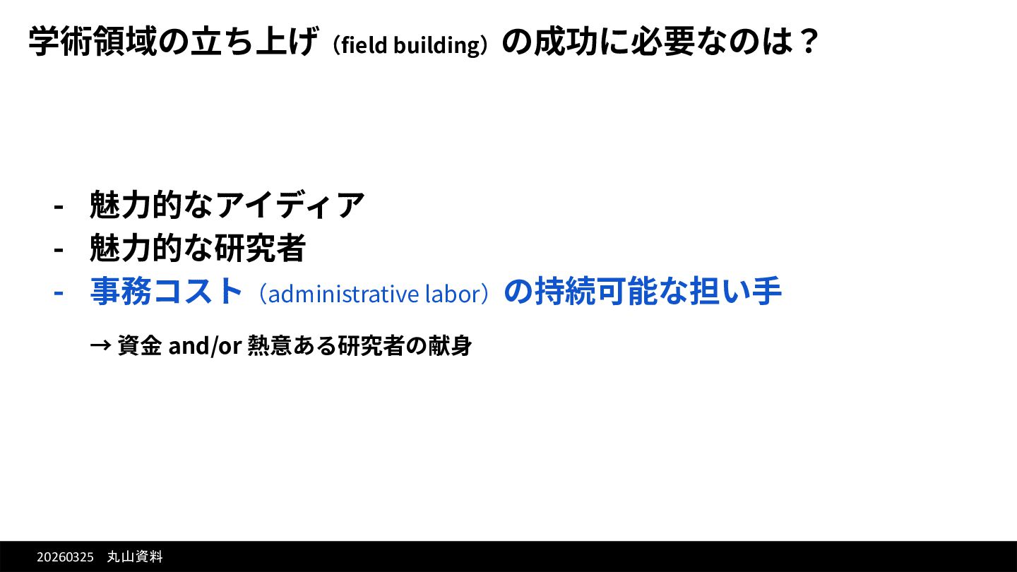 20260325 丸山資料 学術領域の⽴ち上げ(field building)の成功に必要なのは? - 魅⼒的なアイディア - 魅⼒的な研究者 - 事務コスト(administrative
