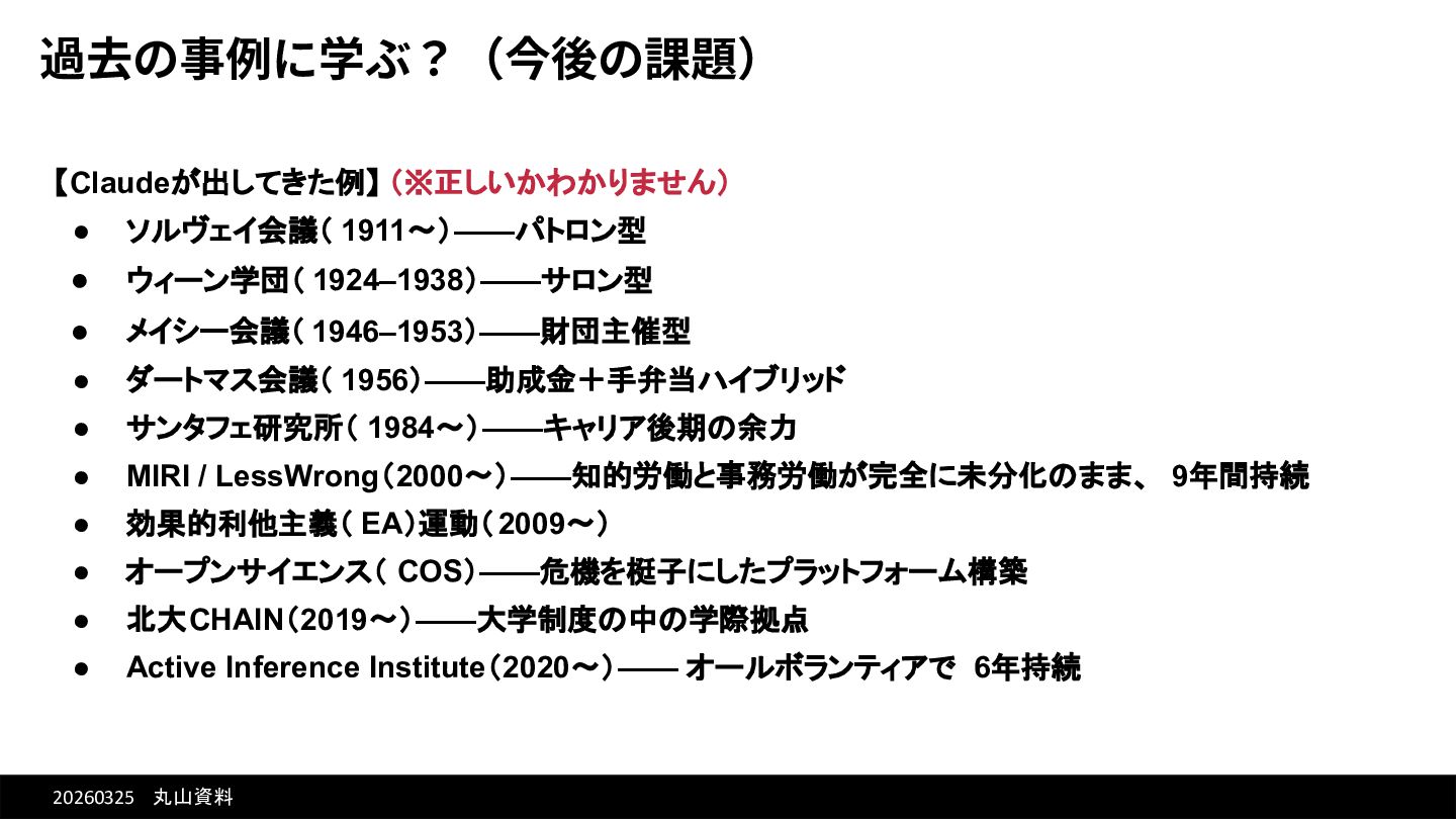 20260325 丸山資料 過去の事例に学ぶ?(今後の課題) 【Claudeが出してきた例】 (※正しいかわかりません) • ソルヴェイ会議( 1911〜)——パトロン型 • ウィーン学団(