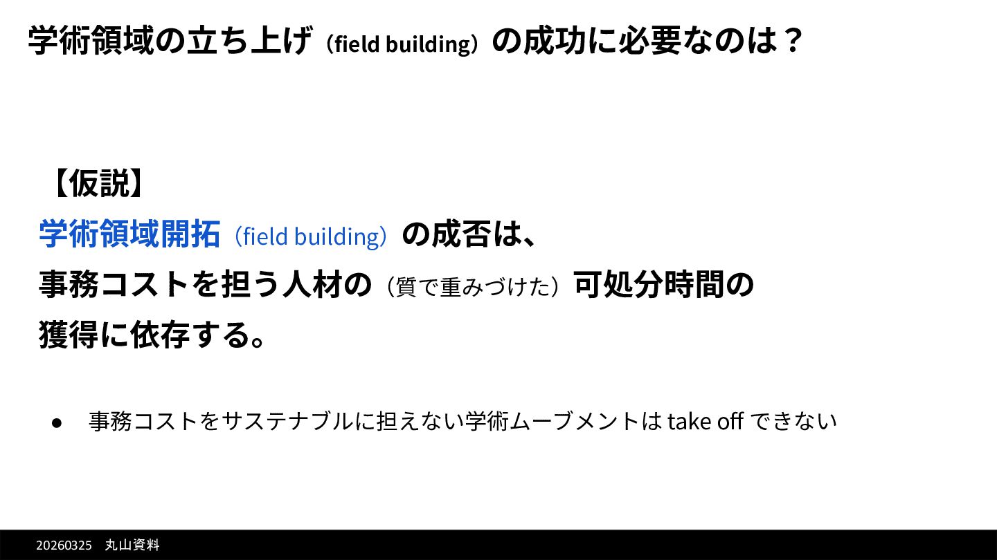 20260325 丸山資料 学術領域の⽴ち上げ(field building)の成功に必要なのは? 【仮説】 学術領域開拓(field building)の成否は、 事務コストを担う⼈材の(質で重みづけた)可処分時間の 獲得に依存する。 •