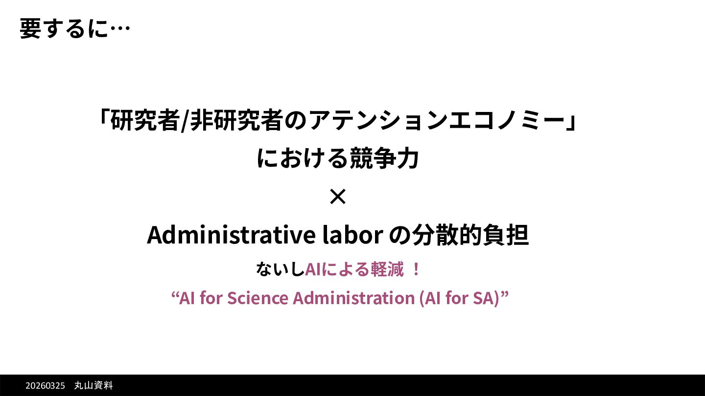 20260325 丸山資料 要するに… 「研究者/⾮研究者のアテンションエコノミー」 における競争⼒ × Administrative labor の分散的負担 ないしAIによる軽減