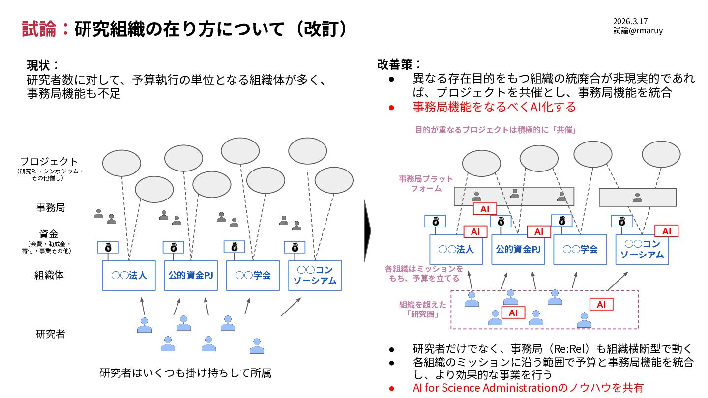 (研究PJ‧シンポジウム‧ その他催し) 事務局 研究者 研究者はいくつも掛け持ちして所属 現状: 研究者数に対して、予算執⾏の単位となる組織体が多く、 事務局機能も不⾜ ◦◦法⼈ 公的資⾦PJ ◦◦学会 ◦◦コン ソーシアム 事務局プラット フォーム ⽬的が重なるプロジェクトは積極的に「共催」 改善策: • 異なる存在⽬的をもつ組織の統廃合が⾮現実的であれ ば、プロジェクトを共催とし、事務局機能を統合 • 事務局機能をなるべくAI化する • 研究者だけでなく、事務局(Re:Rel)も組織横断型で動く • 各組織のミッションに沿う範囲で予算と事務局機能を統合 し、より効果的な事業を⾏う • AI for Science Administrationのノウハウを共有 2026.3.17 試論@rmaruy 組織を超えた 「研究圏」 各組織はミッションを もち、予算を⽴てる 試論:研究組織の在り⽅について(改訂) AI AI AI AI AI AI