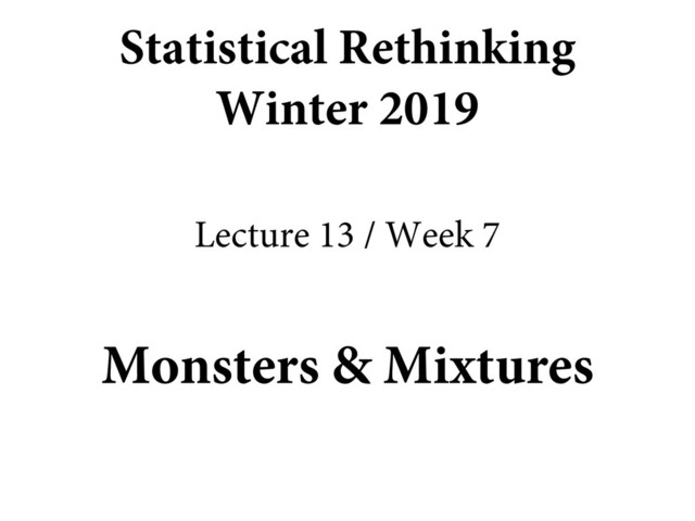 Lecture 13 of the Dec 2018 through March 2019 edition of Statistical Rethinking. Covers Chapters 11 and 12, generalized linear models and simple mixtures.