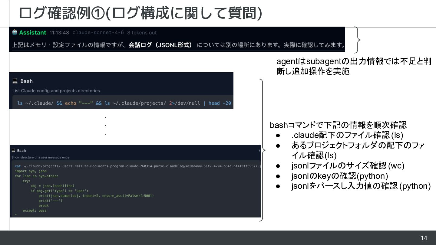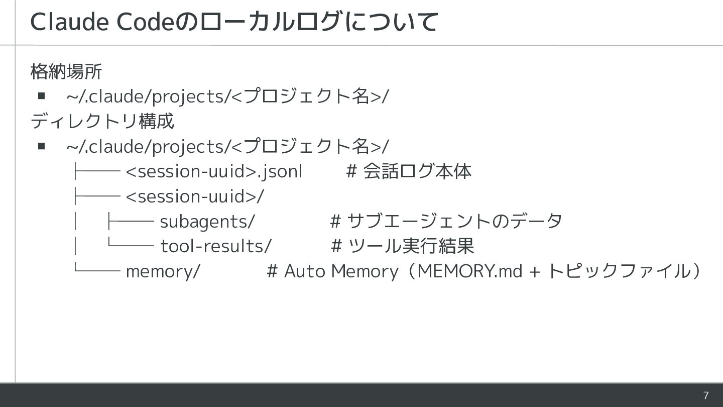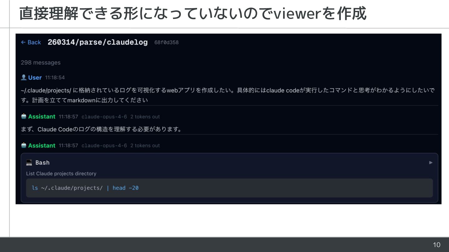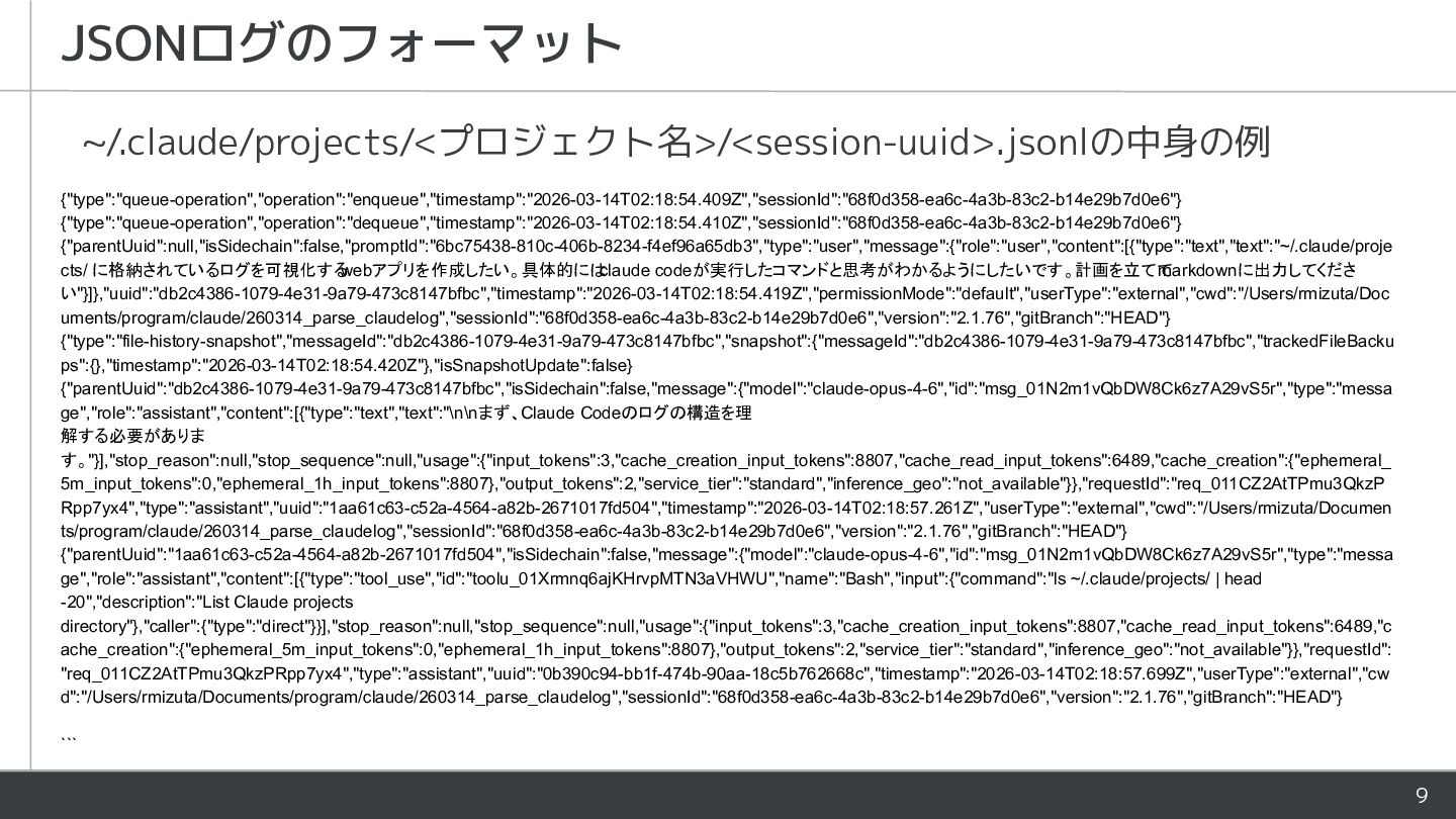 uments/program/claude/260314_parse_claudelog","sessionId":"68f0d358-ea6c-4a3b-83c2-b14e29b7d0e6","version":"2.1.76","gitBranch":"HEAD"} {"type":"file-history-snapshot","messageId":"db2c4386-1079-4e31-9a79-473c8147bfbc","snapshot":{"messageId":"db2c4386-1079-4e31-9a79-473c8147bfbc","trackedFileBacku ps":{},"timestamp":"2026-03-14T02:18:54.420Z"},"isSnapshotUpdate":false} {"parentUuid":"db2c4386-1079-4e31-9a79-473c8147bfbc","isSidechain":false,"message":{"model":"claude-opus-4-6","id":"msg_01N2m1vQbDW8Ck6z7A29vS5r","type":"messa ge","role":"assistant","content":[{"type":"text","text":"\n\nまず、Claude Codeのログの構造を理 解する必要がありま す。"}],"stop_reason":null,"stop_sequence":null,"usage":{"input_tokens":3,"cache_creation_input_tokens":8807,"cache_read_input_tokens":6489,"cache_creation":{"ephemeral_ 5m_input_tokens":0,"ephemeral_1h_input_tokens":8807},"output_tokens":2,"service_tier":"standard","inference_geo":"not_available"}},"requestId":"req_011CZ2AtTPmu3QkzP Rpp7yx4","type":"assistant","uuid":"1aa61c63-c52a-4564-a82b-2671017fd504","timestamp":"2026-03-14T02:18:57.261Z","userType":"external","cwd":"/Users/rmizuta/Documen ts/program/claude/260314_parse_claudelog","sessionId":"68f0d358-ea6c-4a3b-83c2-b14e29b7d0e6","version":"2.1.76","gitBranch":"HEAD"} {"parentUuid":"1aa61c63-c52a-4564-a82b-2671017fd504","isSidechain":false,"message":{"model":"claude-opus-4-6","id":"msg_01N2m1vQbDW8Ck6z7A29vS5r","type":"messa ge","role":"assistant","content":[{"type":"tool_use","id":"toolu_01Xrmnq6ajKHrvpMTN3aVHWU","name":"Bash","input":{"command":"ls ~/.claude/projects/ | head -20","description":"List Claude projects directory"},"caller":{"type":"direct"}}],"stop_reason":null,"stop_sequence":null,"usage":{"input_tokens":3,"cache_creation_input_tokens":8807,"cache_read_input_tokens":6489,"c ache_creation":{"ephemeral_5m_input_tokens":0,"ephemeral_1h_input_tokens":8807},"output_tokens":2,"service_tier":"standard","inference_geo":"not_available"}},"requestId": "req_011CZ2AtTPmu3QkzPRpp7yx4","type":"assistant","uuid":"0b390c94-bb1f-474b-90aa-18c5b762668c","timestamp":"2026-03-14T02:18:57.699Z","userType":"external","cw d":"/Users/rmizuta/Documents/program/claude/260314_parse_claudelog","sessionId":"68f0d358-ea6c-4a3b-83c2-b14e29b7d0e6","version":"2.1.76","gitBranch":"HEAD"} ``` JSONログのフォーマット 9 ~/.claude/projects/<プロジェクト名>/<session-uuid>.jsonlの中身の例