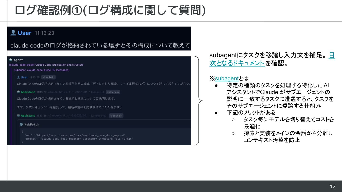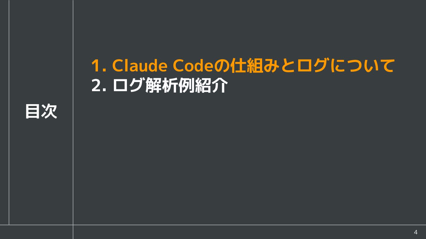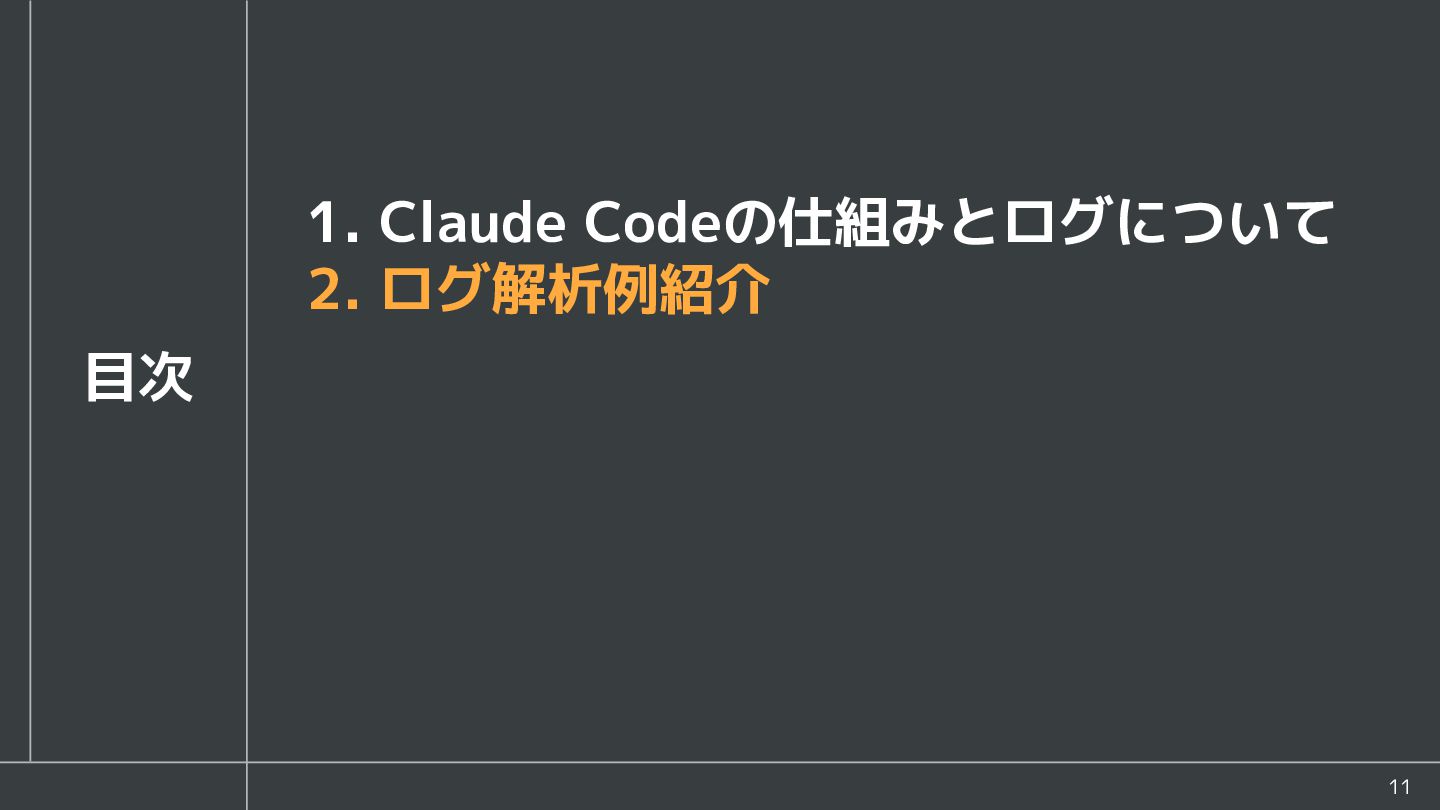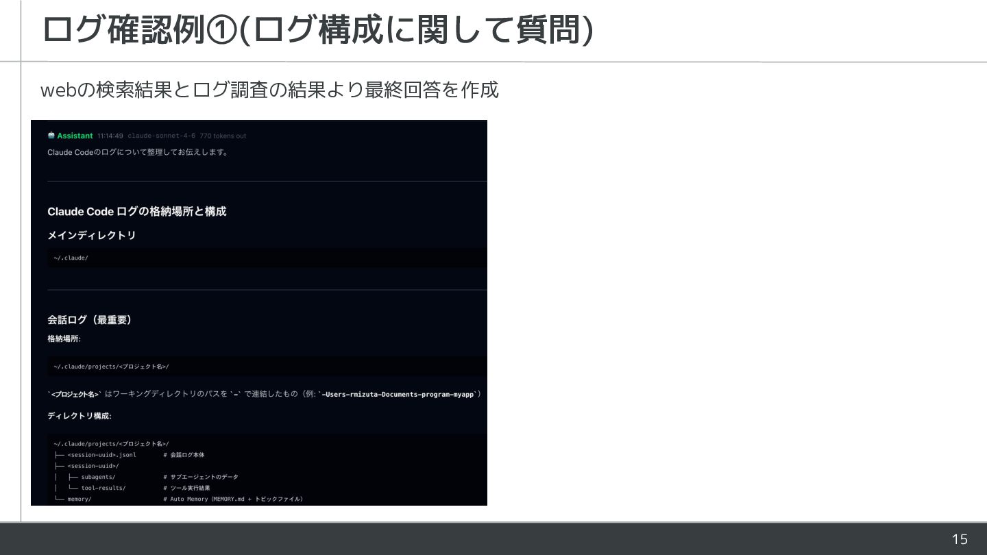 uments/program/claude/260314_parse_claudelog","sessionId":"68f0d358-ea6c-4a3b-83c2-b14e29b7d0e6","version":"2.1.76","gitBranch":"HEAD"} {"type":"file-history-snapshot","messageId":"db2c4386-1079-4e31-9a79-473c8147bfbc","snapshot":{"messageId":"db2c4386-1079-4e31-9a79-473c8147bfbc","trackedFileBacku ps":{},"timestamp":"2026-03-14T02:18:54.420Z"},"isSnapshotUpdate":false} {"parentUuid":"db2c4386-1079-4e31-9a79-473c8147bfbc","isSidechain":false,"message":{"model":"claude-opus-4-6","id":"msg_01N2m1vQbDW8Ck6z7A29vS5r","type":"messa ge","role":"assistant","content":[{"type":"text","text":"\n\nまず、Claude Codeのログの構造を理 解する必要がありま す。"}],"stop_reason":null,"stop_sequence":null,"usage":{"input_tokens":3,"cache_creation_input_tokens":8807,"cache_read_input_tokens":6489,"cache_creation":{"ephemeral_ 5m_input_tokens":0,"ephemeral_1h_input_tokens":8807},"output_tokens":2,"service_tier":"standard","inference_geo":"not_available"}},"requestId":"req_011CZ2AtTPmu3QkzP Rpp7yx4","type":"assistant","uuid":"1aa61c63-c52a-4564-a82b-2671017fd504","timestamp":"2026-03-14T02:18:57.261Z","userType":"external","cwd":"/Users/rmizuta/Documen ts/program/claude/260314_parse_claudelog","sessionId":"68f0d358-ea6c-4a3b-83c2-b14e29b7d0e6","version":"2.1.76","gitBranch":"HEAD"} {"parentUuid":"1aa61c63-c52a-4564-a82b-2671017fd504","isSidechain":false,"message":{"model":"claude-opus-4-6","id":"msg_01N2m1vQbDW8Ck6z7A29vS5r","type":"messa ge","role":"assistant","content":[{"type":"tool_use","id":"toolu_01Xrmnq6ajKHrvpMTN3aVHWU","name":"Bash","input":{"command":"ls ~/.claude/projects/ | head -20","description":"List Claude projects directory"},"caller":{"type":"direct"}}],"stop_reason":null,"stop_sequence":null,"usage":{"input_tokens":3,"cache_creation_input_tokens":8807,"cache_read_input_tokens":6489,"c ache_creation":{"ephemeral_5m_input_tokens":0,"ephemeral_1h_input_tokens":8807},"output_tokens":2,"service_tier":"standard","inference_geo":"not_available"}},"requestId": "req_011CZ2AtTPmu3QkzPRpp7yx4","type":"assistant","uuid":"0b390c94-bb1f-474b-90aa-18c5b762668c","timestamp":"2026-03-14T02:18:57.699Z","userType":"external","cw d":"/Users/rmizuta/Documents/program/claude/260314_parse_claudelog","sessionId":"68f0d358-ea6c-4a3b-83c2-b14e29b7d0e6","version":"2.1.76","gitBranch":"HEAD"} ``` JSONログのフォーマット 9 ~/.claude/projects/<プロジェクト名>/<session-uuid>.jsonlの中身の例