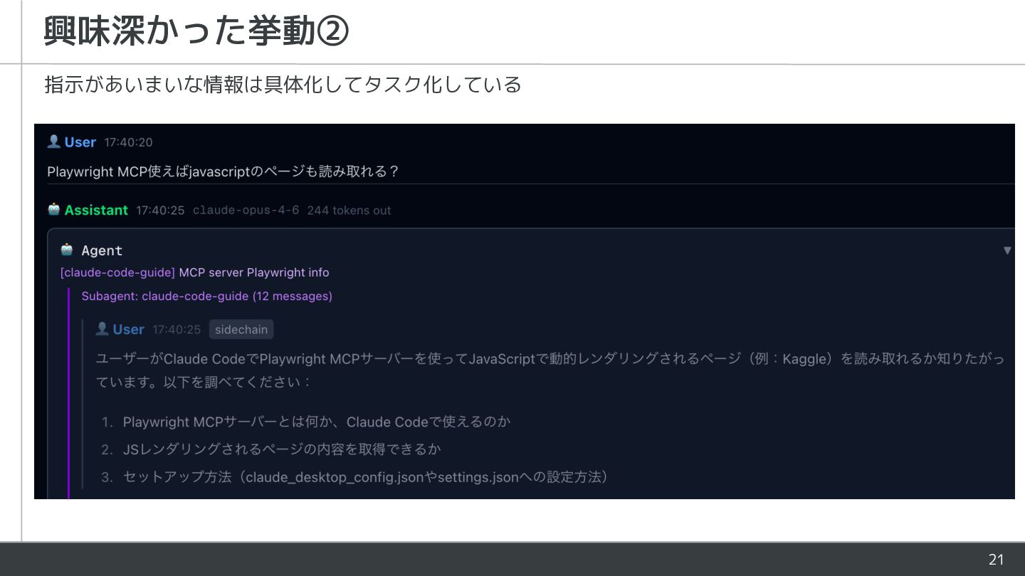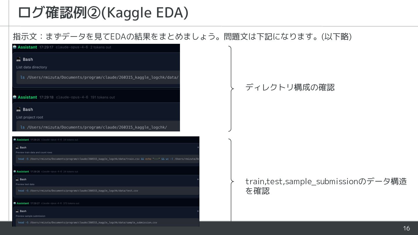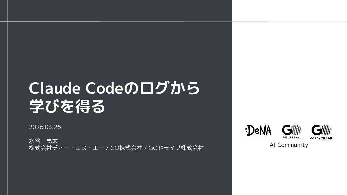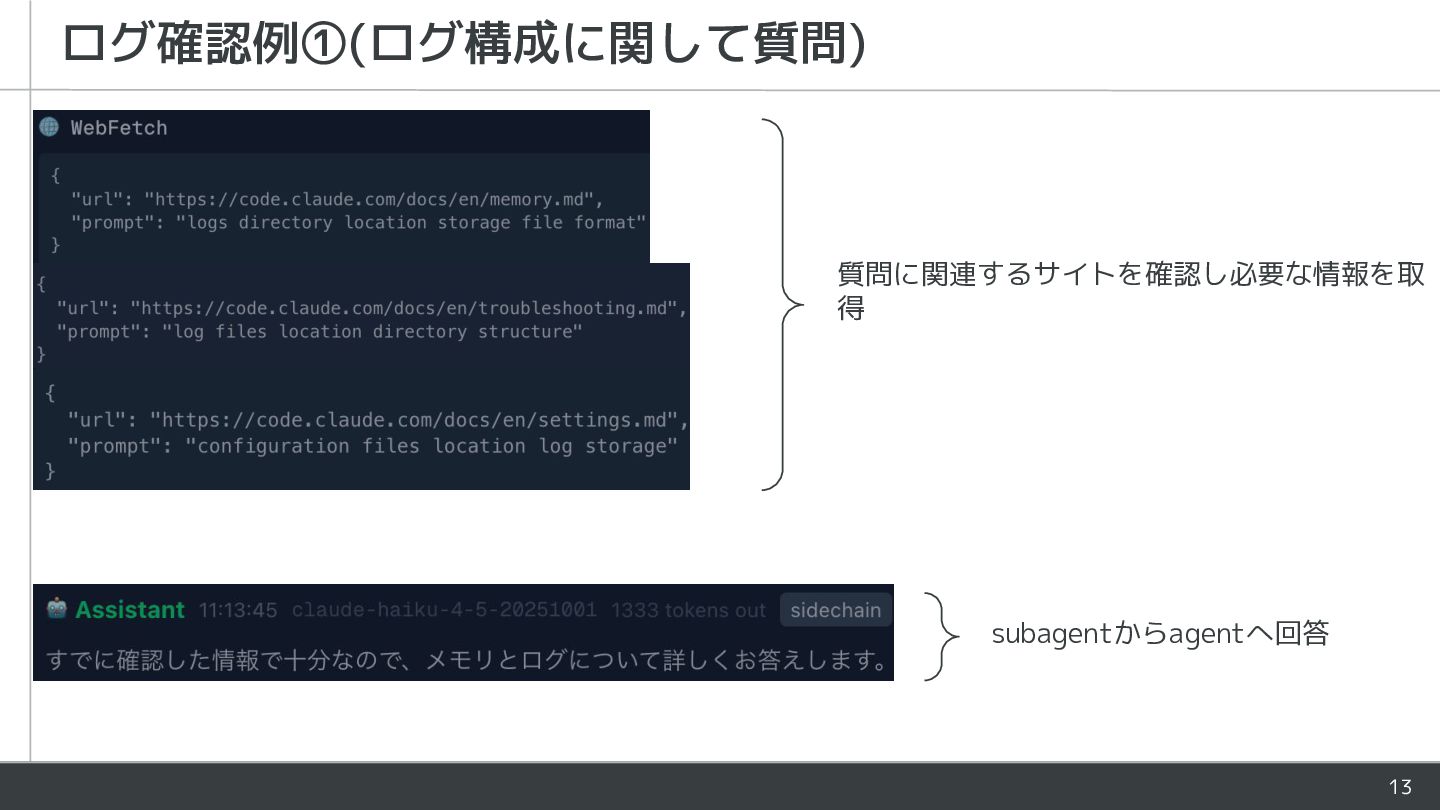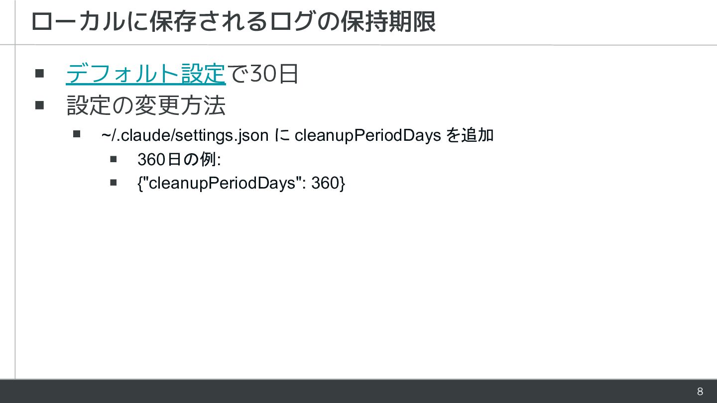 uments/program/claude/260314_parse_claudelog","sessionId":"68f0d358-ea6c-4a3b-83c2-b14e29b7d0e6","version":"2.1.76","gitBranch":"HEAD"} {"type":"file-history-snapshot","messageId":"db2c4386-1079-4e31-9a79-473c8147bfbc","snapshot":{"messageId":"db2c4386-1079-4e31-9a79-473c8147bfbc","trackedFileBacku ps":{},"timestamp":"2026-03-14T02:18:54.420Z"},"isSnapshotUpdate":false} {"parentUuid":"db2c4386-1079-4e31-9a79-473c8147bfbc","isSidechain":false,"message":{"model":"claude-opus-4-6","id":"msg_01N2m1vQbDW8Ck6z7A29vS5r","type":"messa ge","role":"assistant","content":[{"type":"text","text":"\n\nまず、Claude Codeのログの構造を理 解する必要がありま す。"}],"stop_reason":null,"stop_sequence":null,"usage":{"input_tokens":3,"cache_creation_input_tokens":8807,"cache_read_input_tokens":6489,"cache_creation":{"ephemeral_ 5m_input_tokens":0,"ephemeral_1h_input_tokens":8807},"output_tokens":2,"service_tier":"standard","inference_geo":"not_available"}},"requestId":"req_011CZ2AtTPmu3QkzP Rpp7yx4","type":"assistant","uuid":"1aa61c63-c52a-4564-a82b-2671017fd504","timestamp":"2026-03-14T02:18:57.261Z","userType":"external","cwd":"/Users/rmizuta/Documen ts/program/claude/260314_parse_claudelog","sessionId":"68f0d358-ea6c-4a3b-83c2-b14e29b7d0e6","version":"2.1.76","gitBranch":"HEAD"} {"parentUuid":"1aa61c63-c52a-4564-a82b-2671017fd504","isSidechain":false,"message":{"model":"claude-opus-4-6","id":"msg_01N2m1vQbDW8Ck6z7A29vS5r","type":"messa ge","role":"assistant","content":[{"type":"tool_use","id":"toolu_01Xrmnq6ajKHrvpMTN3aVHWU","name":"Bash","input":{"command":"ls ~/.claude/projects/ | head -20","description":"List Claude projects directory"},"caller":{"type":"direct"}}],"stop_reason":null,"stop_sequence":null,"usage":{"input_tokens":3,"cache_creation_input_tokens":8807,"cache_read_input_tokens":6489,"c ache_creation":{"ephemeral_5m_input_tokens":0,"ephemeral_1h_input_tokens":8807},"output_tokens":2,"service_tier":"standard","inference_geo":"not_available"}},"requestId": "req_011CZ2AtTPmu3QkzPRpp7yx4","type":"assistant","uuid":"0b390c94-bb1f-474b-90aa-18c5b762668c","timestamp":"2026-03-14T02:18:57.699Z","userType":"external","cw d":"/Users/rmizuta/Documents/program/claude/260314_parse_claudelog","sessionId":"68f0d358-ea6c-4a3b-83c2-b14e29b7d0e6","version":"2.1.76","gitBranch":"HEAD"} ``` JSONログのフォーマット 9 ~/.claude/projects/<プロジェクト名>/<session-uuid>.jsonlの中身の例