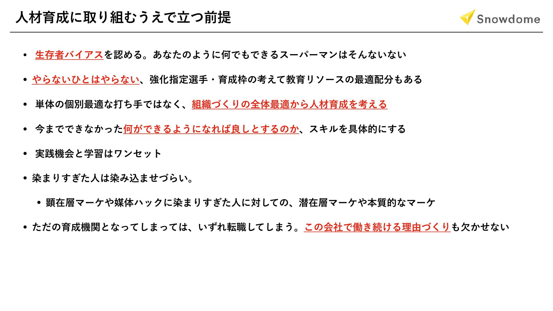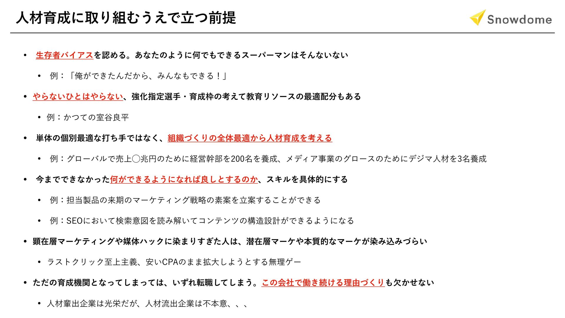 ୯ମͷݸผ࠷దͳଧͪखͰͳ͘ɺ৫ͮ͘Γͷશମ࠷ద͔ΒਓࡐҭΛߟ͑Δ w ྫɿάϩʔόϧͰച্̋ஹԁͷͨΊʹܦӦװ෦Λ໊ΛཆɺϝσΟΞࣄۀͷάϩʔεͷͨΊʹσδϚਓࡐΛ໊ཆ w ࠓ·ͰͰ͖ͳ͔ͬͨԿ͕Ͱ͖ΔΑ͏ʹͳΕྑ͠ͱ͢Δͷ͔ɺεΩϧΛ۩ମతʹ͢Δ w ྫɿ୲ͷདྷظͷϚʔέςΟϯάઓུͷૉҊΛཱҊ͢Δ͜ͱ͕Ͱ͖Δ w ྫɿ4&0ʹ͓͍ͯݕࡧҙਤΛಡΈղ͍ͯίϯςϯπͷߏઃܭ͕Ͱ͖ΔΑ͏ʹͳΔ w ݦࡏϚʔέςΟϯάഔମϋοΫʹછ·Γ͗ͨ͢ਓɺજࡏϚʔέຊ࣭తͳϚʔέ͕છΈࠐΈͮΒ͍ w ϥετΫϦοΫࢸ্ओٛɺ͍҆$1"ͷ··֦େ͠Α͏ͱ͢Δແཧήʔ w ͨͩͷҭػؔͱͳͬͯ͠·ͬͯɺ͍ͣΕస৬ͯ͠͠·͏ɻ͜ͷձࣾͰಇ͖ଓ͚Δཧ༝ͮ͘Γ͔ܽͤͳ͍ w ਓࡐഐग़اۀޫӫ͕ͩɺਓࡐྲྀग़اۀෆຊҙɺɺɺ