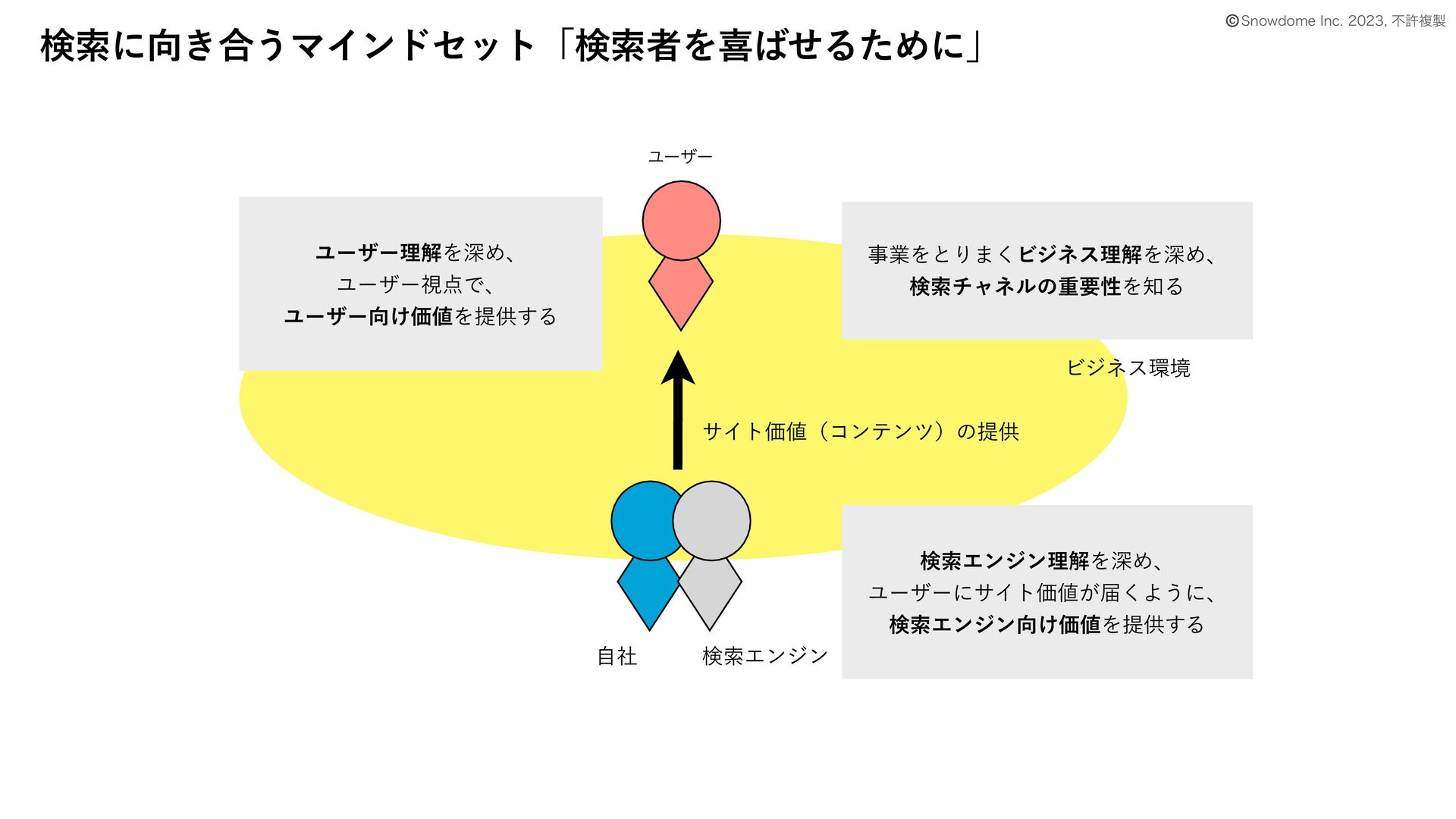ݕࡧʹ͖߹͏ϚΠϯυηοτʮݕࡧऀΛتͤΔͨΊʹʯ © 4OPXEPNF*OD ෆڐෳ Ϣʔβʔ ࣗࣾ ݕࡧΤϯδϯ αΠτՁʢίϯςϯπʣͷఏڙ ϢʔβʔཧղΛਂΊɺ ϢʔβʔࢹͰɺ