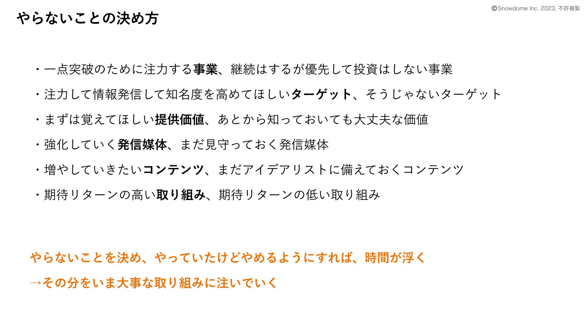 Βͳ͍͜ͱͷܾΊํ © 4OPXEPNF*OD ෆڐෳ ɾҰಥഁͷͨΊʹྗ͢Δࣄۀɺܧଓ͢Δ͕༏ઌͯ͠ࢿ͠ͳ͍ࣄۀ ɾྗͯ͠ใൃ৴໊ͯ͠ΛߴΊͯ΄͍͠λʔήοτɺͦ͏͡Όͳ͍λʔήοτ ɾ·֮ͣ͑ͯ΄͍͠ఏڙՁɺ͋ͱ͔Β͓͍ͬͯͯେৎͳՁ ɾڧԽ͍ͯ͘͠ൃ৴ഔମɺ·ͩݟक͓ͬͯ͘ൃ৴ഔମ ɾ૿͍͖͍ͯͨ͠ίϯςϯπɺ·ͩΞΠσΞϦετʹඋ͓͑ͯ͘ίϯςϯπ ɾظϦλʔϯͷߴ͍औΓΈɺظϦλʔϯͷ͍औΓΈ