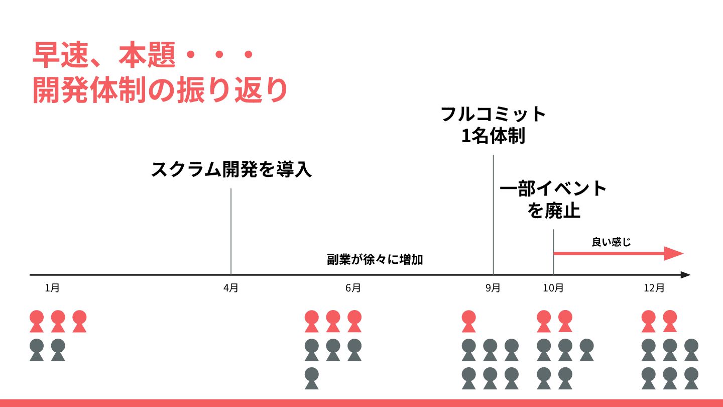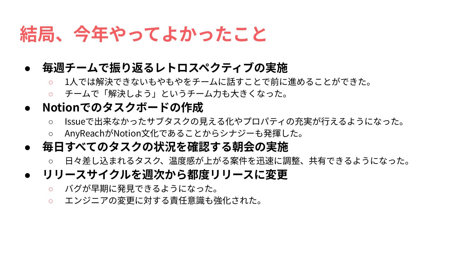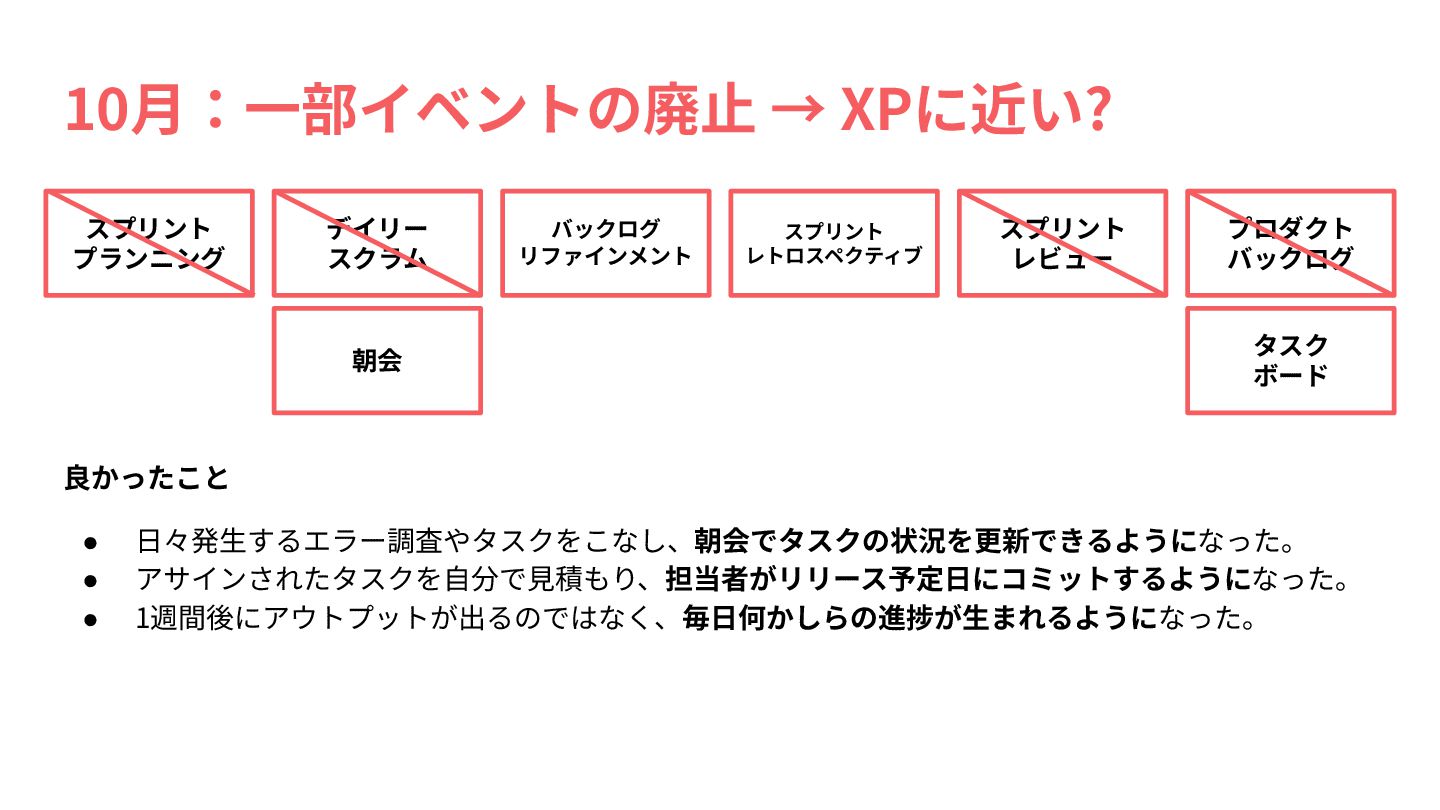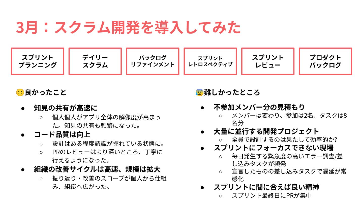 設計はある程度認識が握れている状態に。 ◦ PRのレビューはより深いところ、丁寧に ⾏えるようになった。 • 組織の改善サイクルは⾼速、規模は拡⼤ ◦ 振り返り‧改善のスコープが個⼈から仕組 み、組織へ広がった。 😰難しかったところ • 不参加メンバー分の⾒積もり ◦ メンバーは変わり、参加は2名、タスクは8 名分 • ⼤量に並⾏する開発プロジェクト ◦ 全員で設計するのは果たして効率的か? • スプリントにフォーカスできない現場 ◦ 毎⽇発⽣する緊急度の⾼いエラー調査/差 し込みタスクが頻発 ◦ 宣⾔したものの差し込みタスクで遅延が常 態化 • スプリントに間に合えば良い精神 ◦ スプリント最終⽇にPRが集中 スプリント プランニング デイリー スクラム バックログ リファインメント スプリント レトロスペクティブ スプリント レビュー プロダクト バックログ