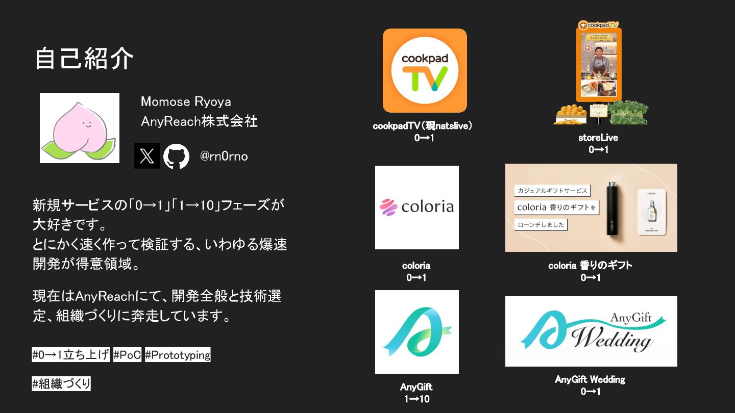自己紹介 新規サービスの「0→1」「1→10」フェーズが 大好きです。 とにかく速く作って検証する、いわゆる爆速 開発が得意領域。 現在はAnyReachにて、開発全般と技術選 定、組織づくりに奔走しています。 Momose Ryoya