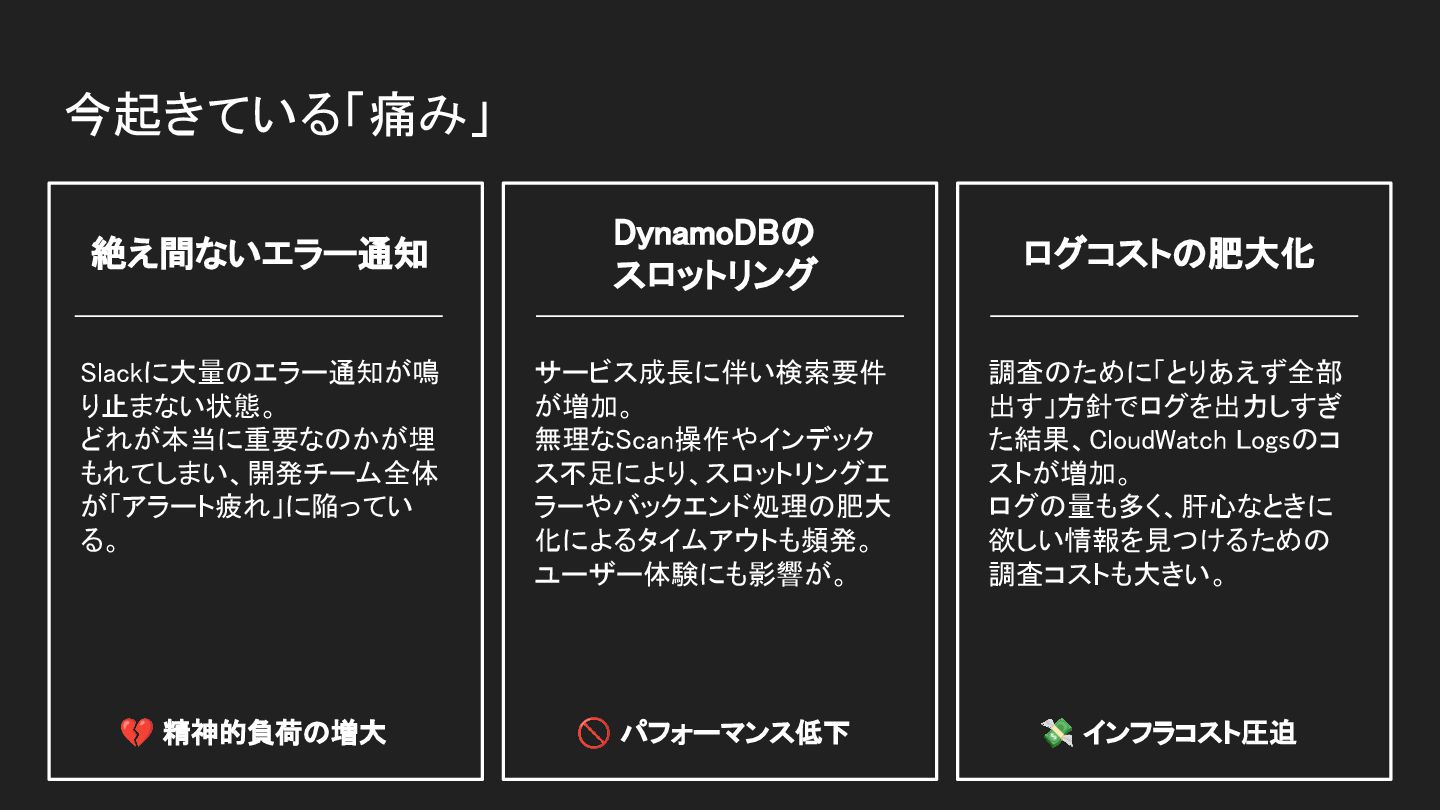 り止まない状態。 どれが本当に重要なのかが埋 もれてしまい、開発チーム全体 が「アラート疲れ」に陥ってい る。 サービス成長に伴い検索要件 が増加。 無理なScan操作やインデック ス不足により、スロットリングエ ラーやバックエンド処理の肥大 化によるタイムアウトも頻発。 ユーザー体験にも影響が。 調査のために「とりあえず全部 出す」方針でログを出力しすぎ た結果、CloudWatch Logsのコ ストが増加。 ログの量も多く、肝心なときに 欲しい情報を見つけるための 調査コストも大きい。 💔 精神的負荷の増大 🚫 パフォーマンス低下 💸 インフラコスト圧迫