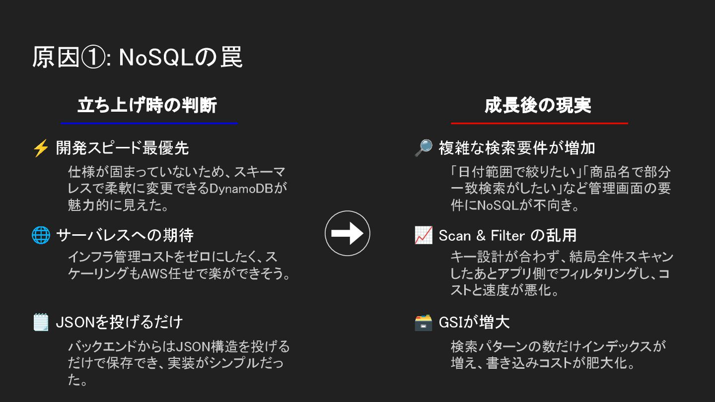 原因①: NoSQLの罠 立ち上げ時の判断 成長後の現実 ⚡ 開発スピード最優先 🌐 サーバレスへの期待