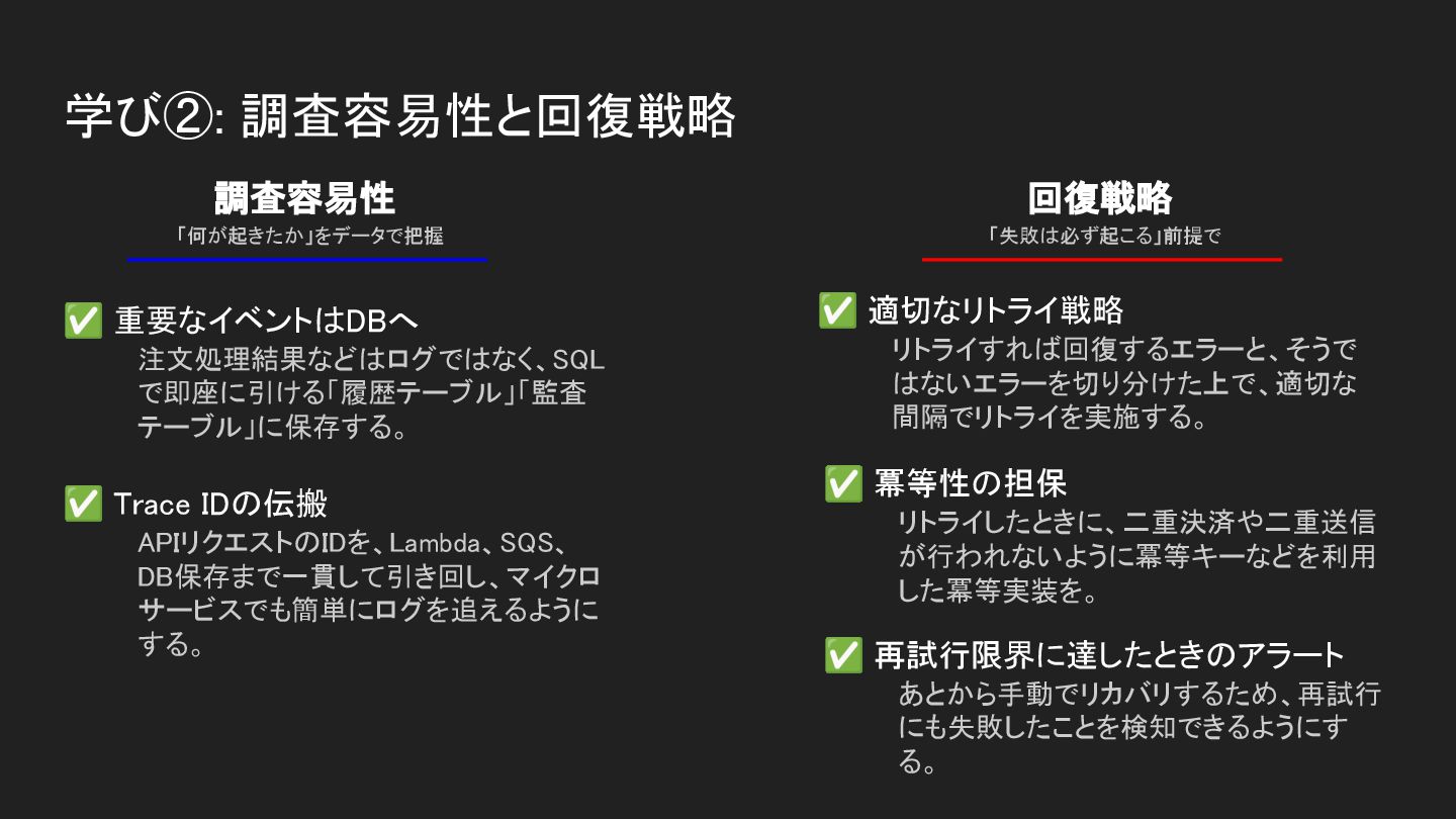 学び②: 調査容易性と回復戦略 調査容易性 回復戦略 ✅ Trace IDの伝搬 APIリクエストのIDを、Lambda、SQS、 DB保存まで一貫して引き回し、マイクロ